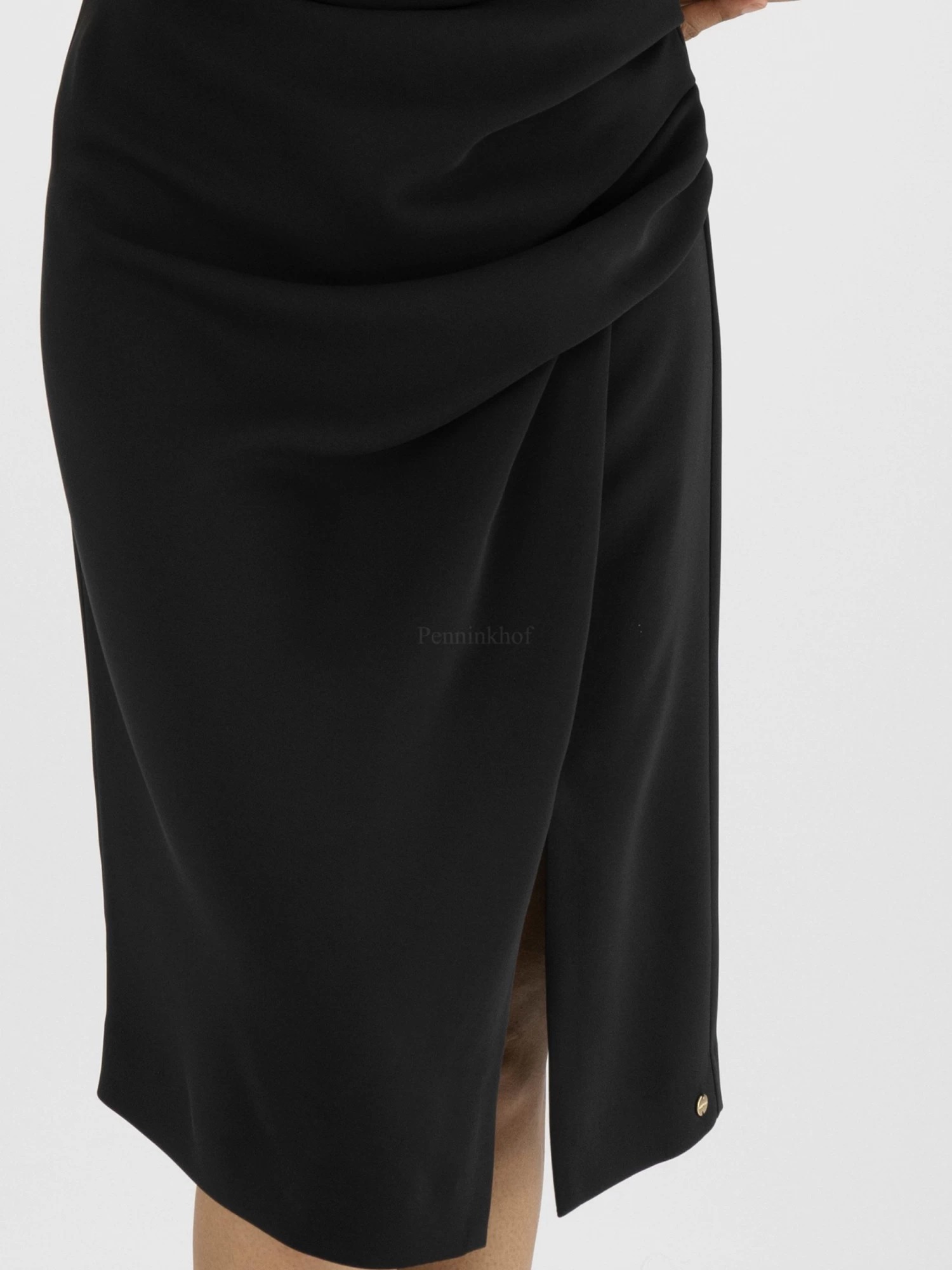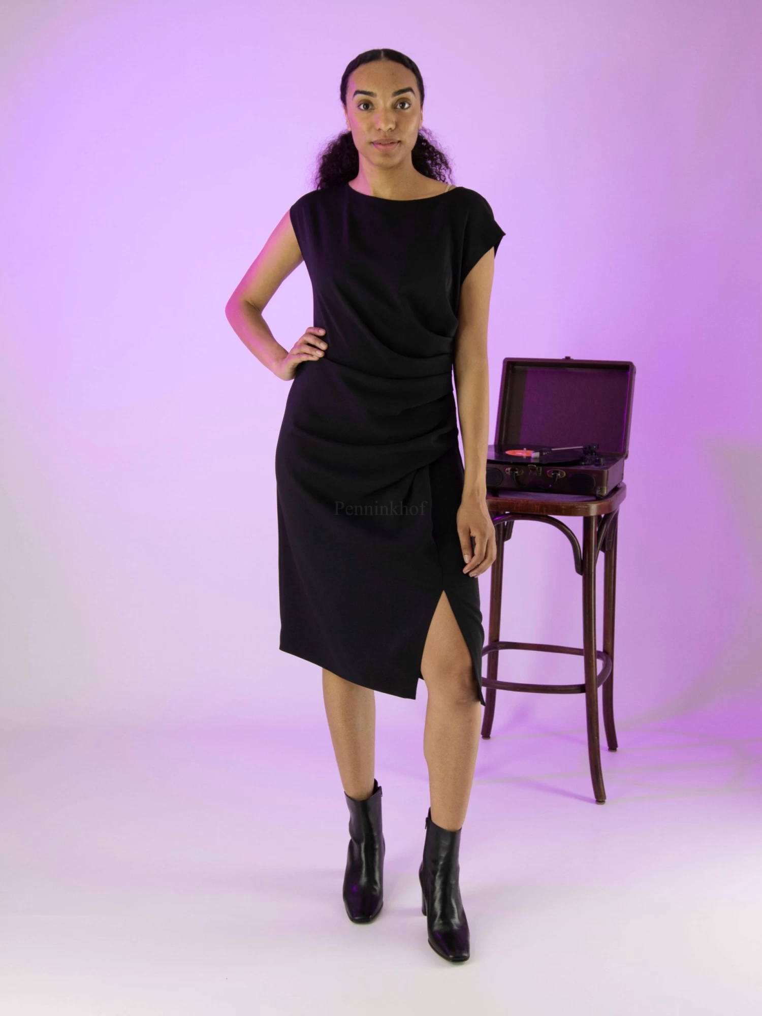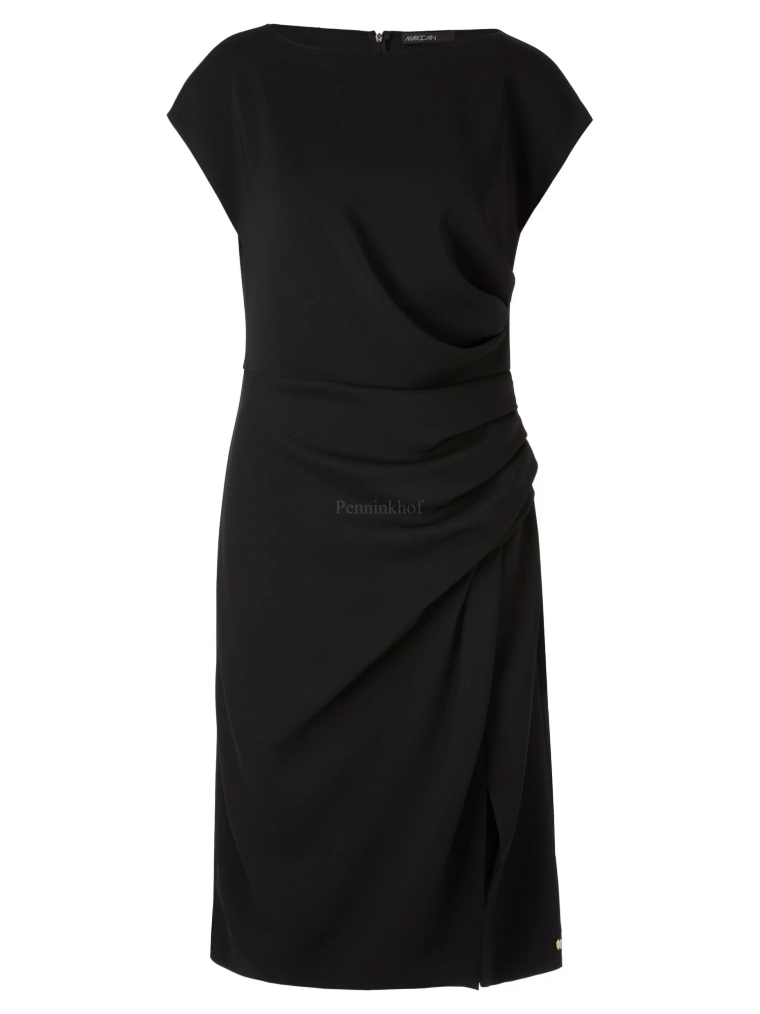 Een jurk van Marc Cain in de kleur zwart. Ter hoogte van de taille is de stof aan de linker zijkant geplooid wat een drapeer effect creëert. Aan de onderkant is links van het midden een split tot onder de knie. De jurk heeft een ronde hals en aan de achterkant is in het midden een rits tot onder de taille. Deze jurk mag op de hand worden gewassen.