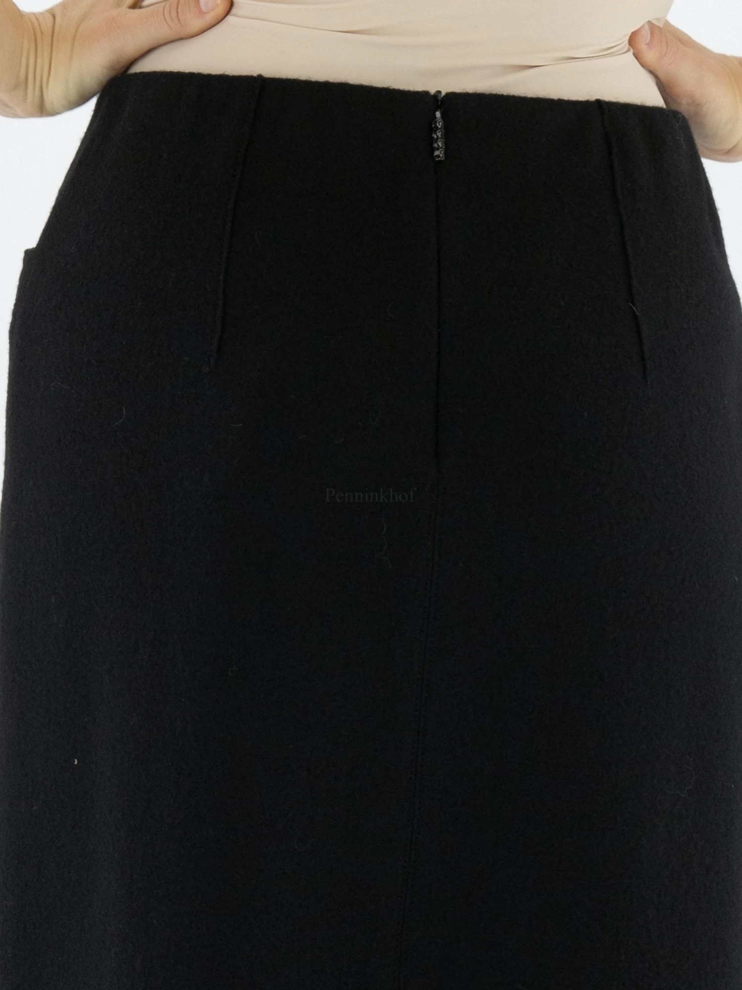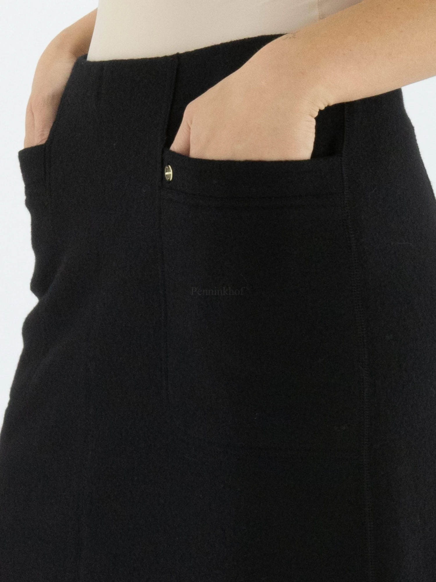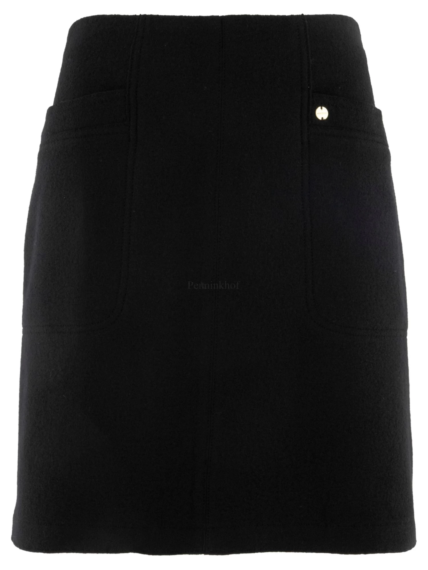 Een korte rok van Marc Cain in een gekookte wol kwaliteit in de kleur zwart. De rok heeft aan de voorzijde 2 zakken en is gevoerd. Deze rok mag niet worden gewassen.