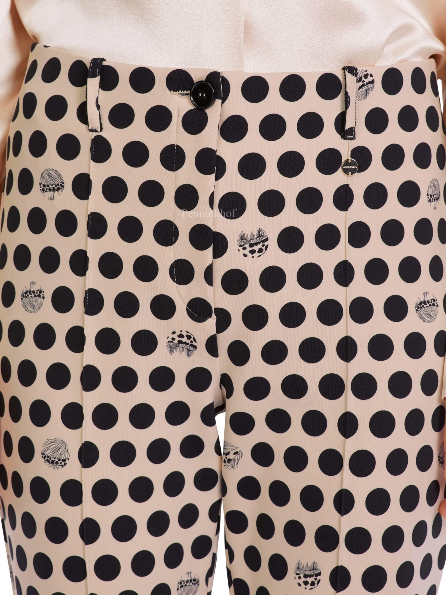 Een broek van Marc Cain in een print van zwarte bollen op een beige achtergrond. In de taille is een elastieken band. In het midden van de pijpen is een stiknaad. deze broek mag op 30 graden worden gewassen.