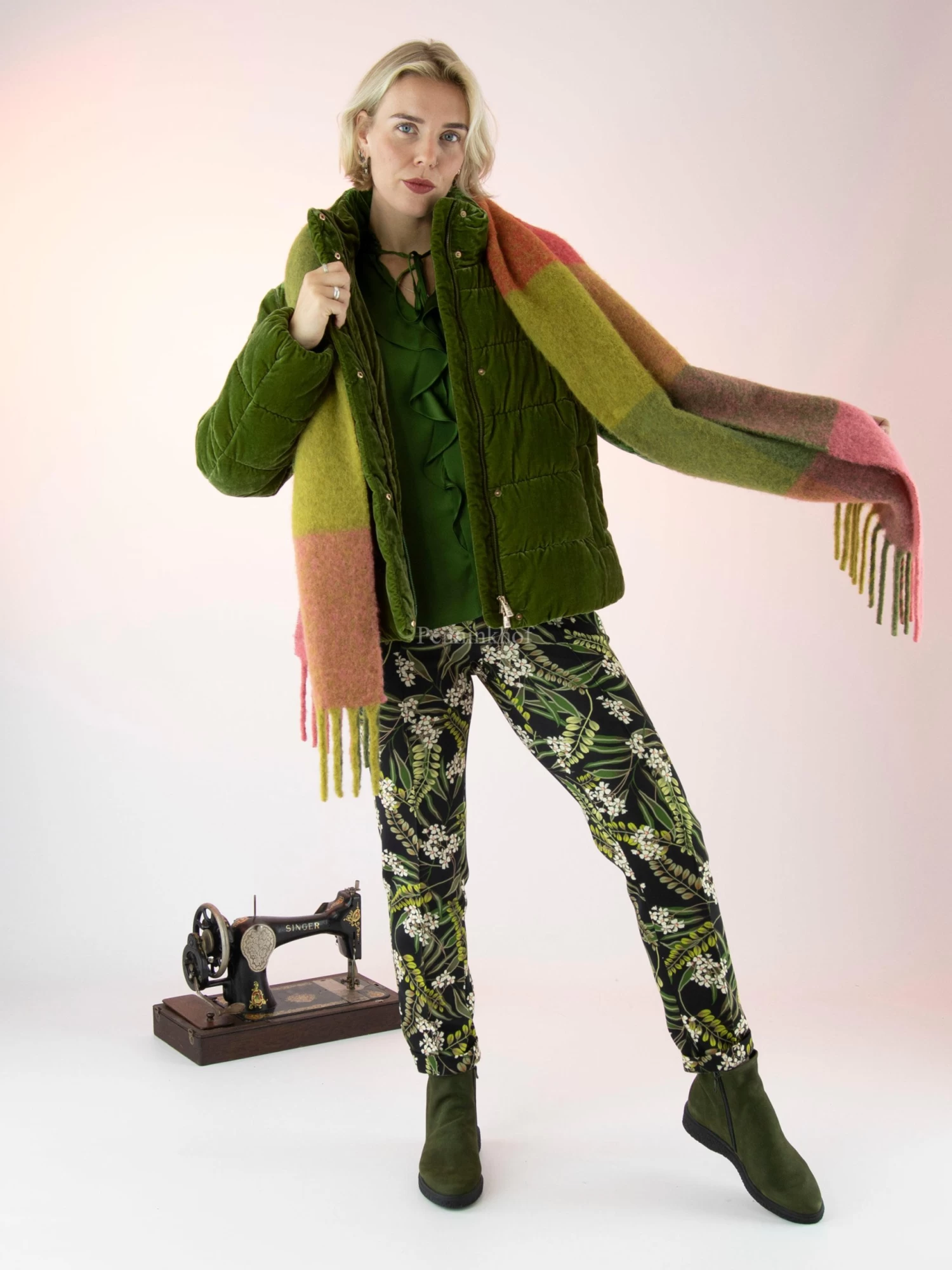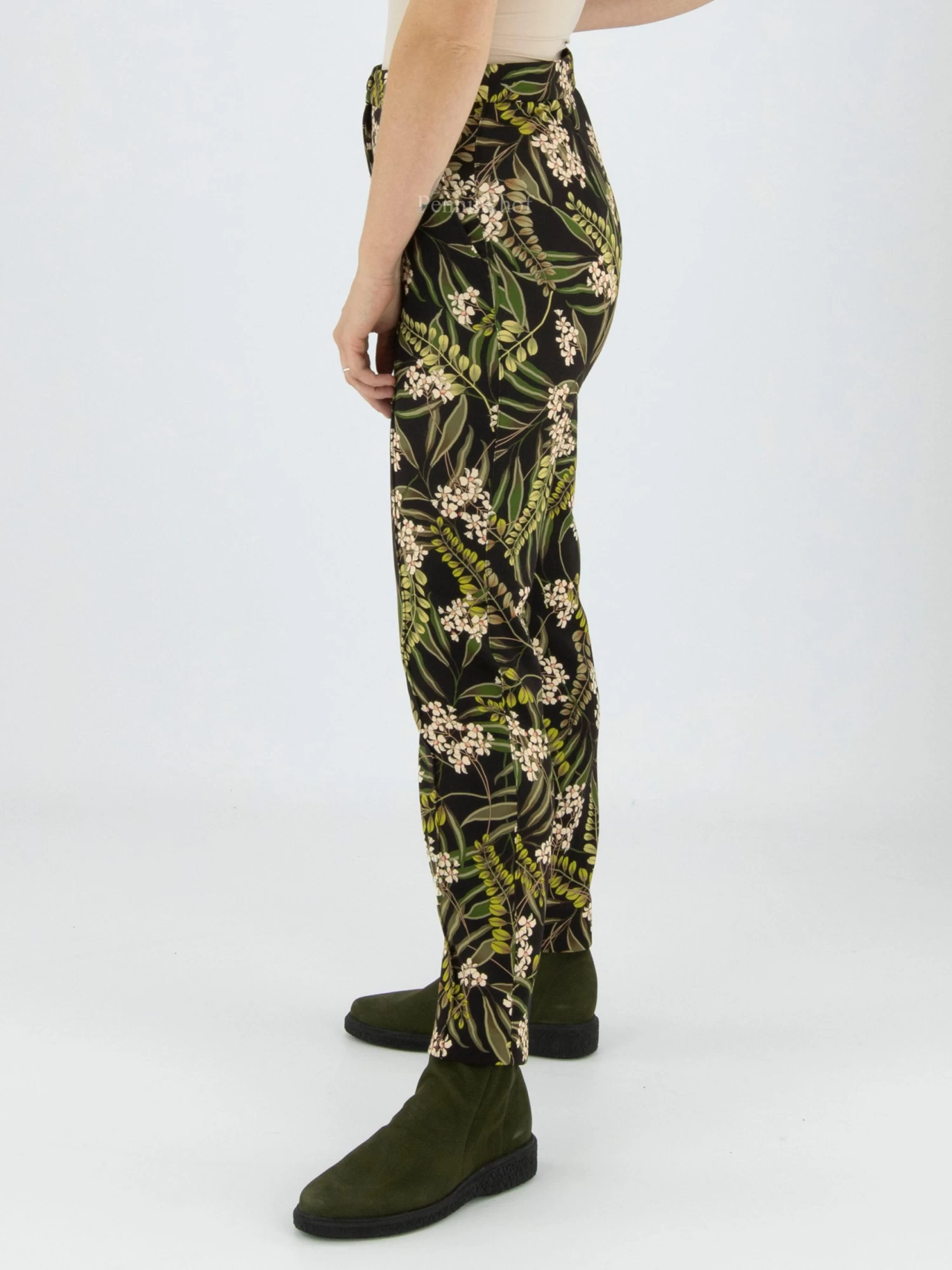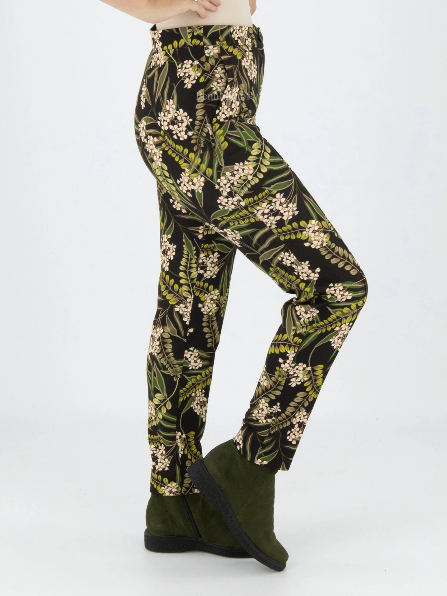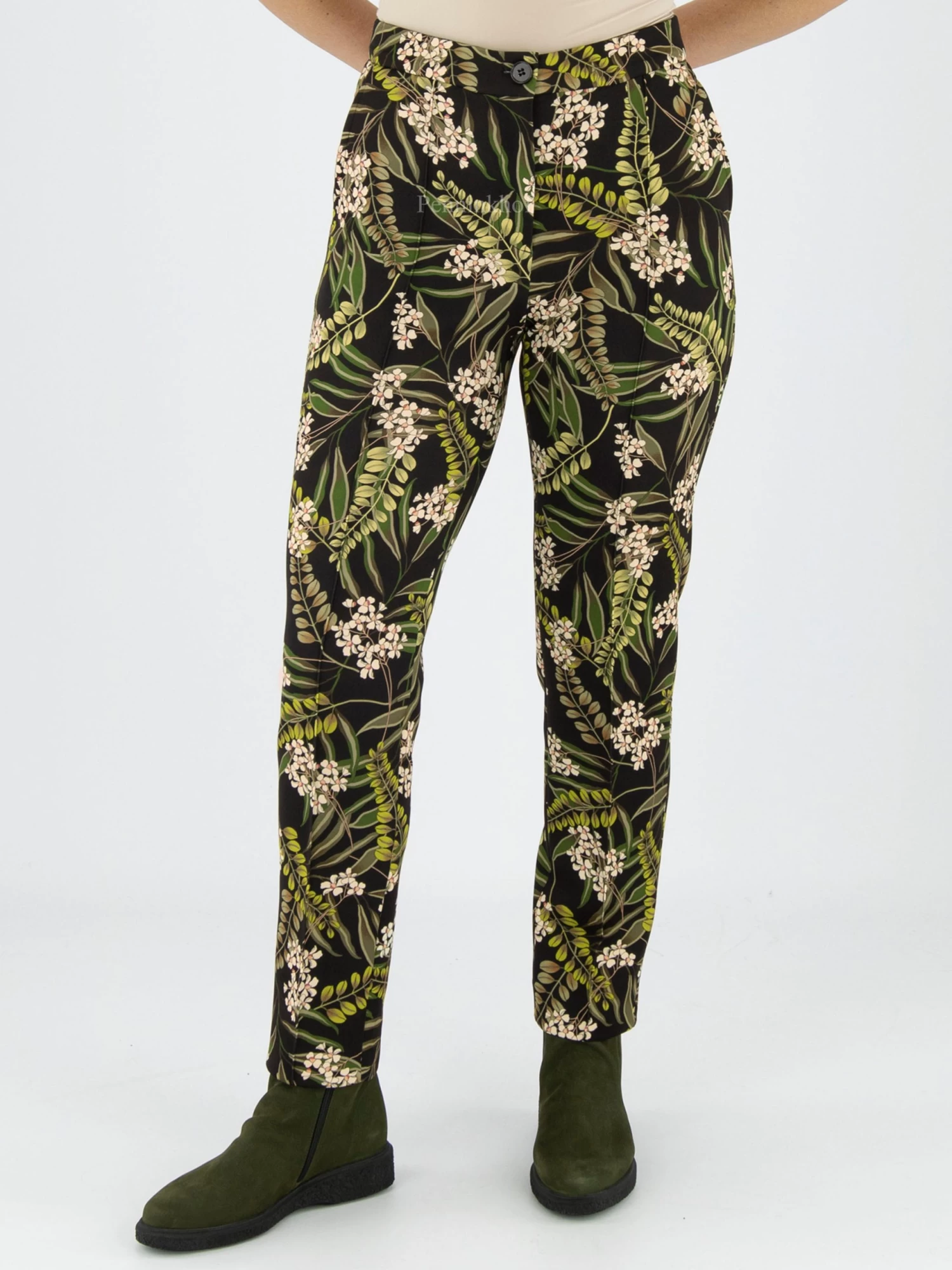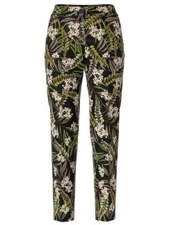 Een broek van Marc Cain in een print van lelietjes van dalen met meerdere tinten groen en roomwit op een zwarte achtergrond. De broek heeft steekzakken en in het midden van de pijpen is een stiknaad. Deze broek mag op 30 graden worden gewassen.
