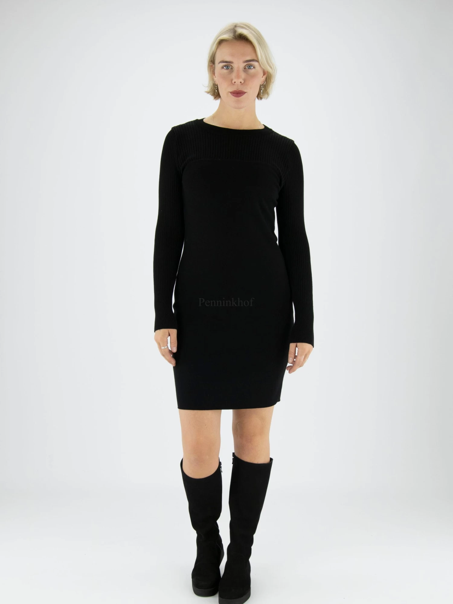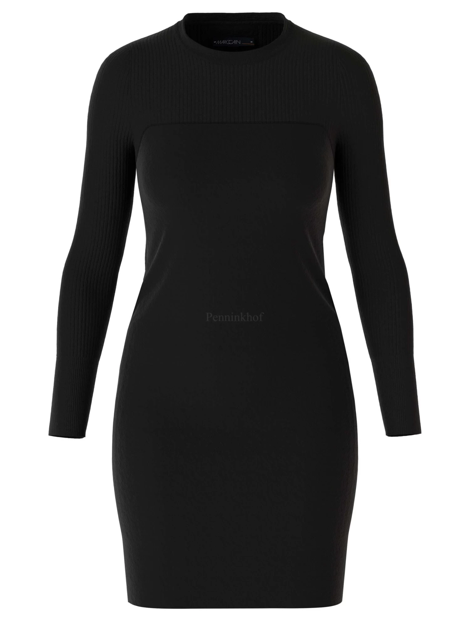 Een jurk van Marc Cain in de kleur zwart. Vanaf de ronde hals tot aan de buste samen met de lange mouwen is de stof geribbeld. vanaf de buste naar beneden is de stof glad. Deze jurk mag op 30 graden worden gewassen.