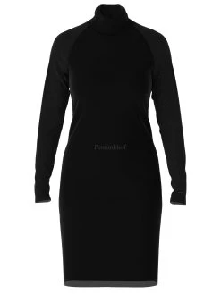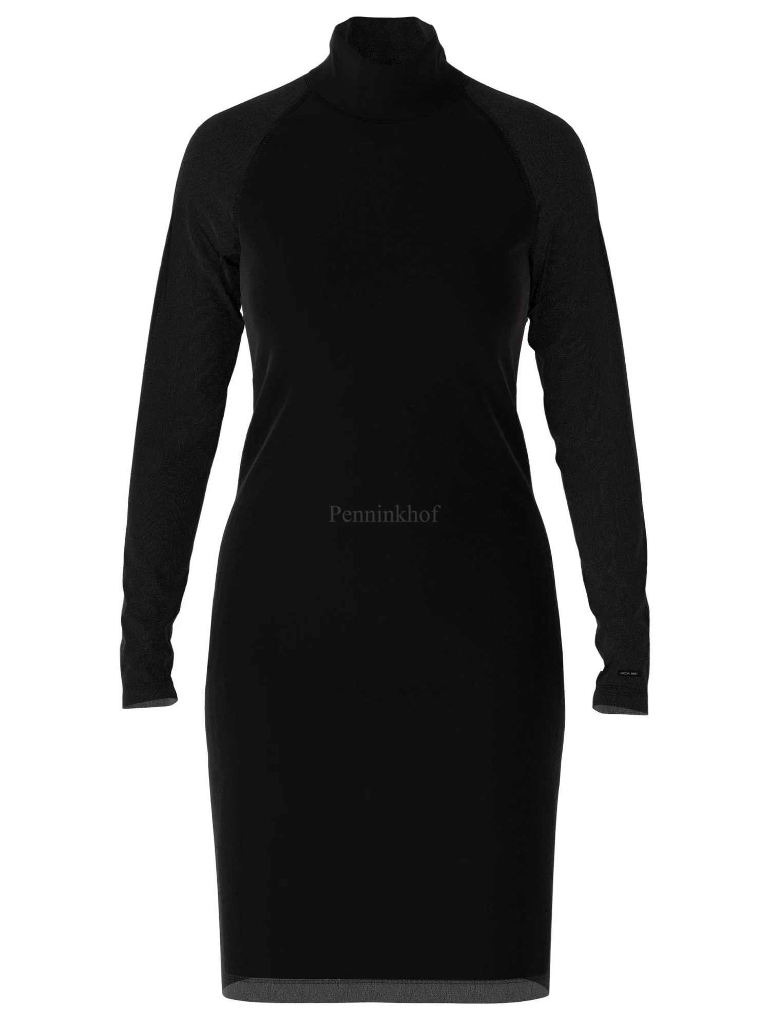 Een velour jurk van Marc Cain in de kleur zwart. De jurk heeft een vallende hoge hals. Vanaf de schouders is de stof van de lange mouwen licht transparant. De jurk is gevoerd en mag op 30 graden worden gewassen.