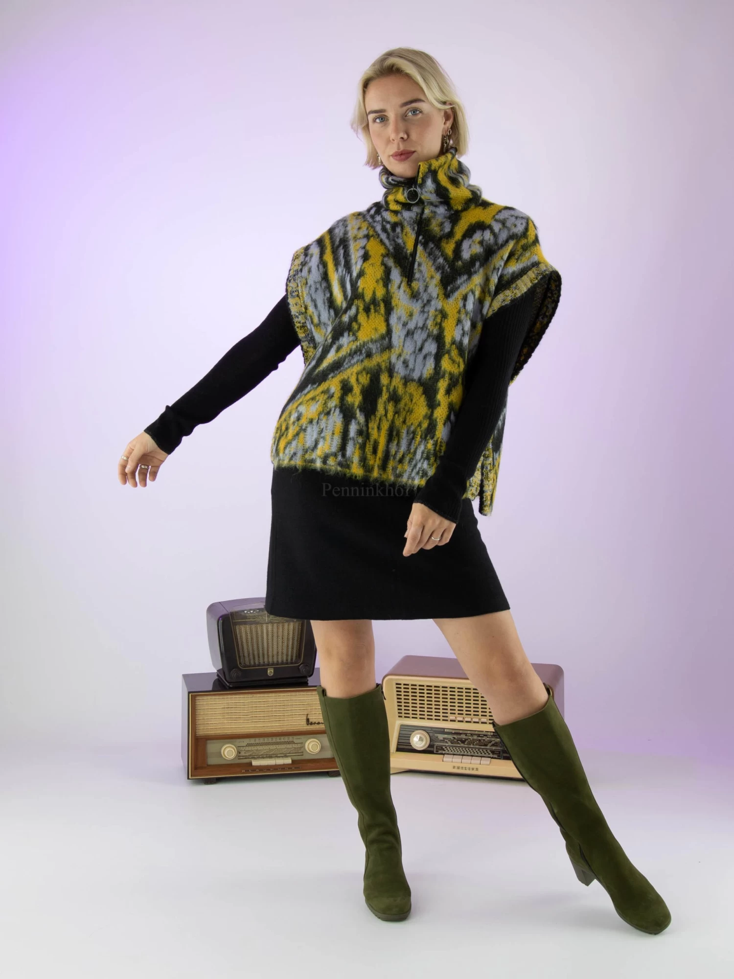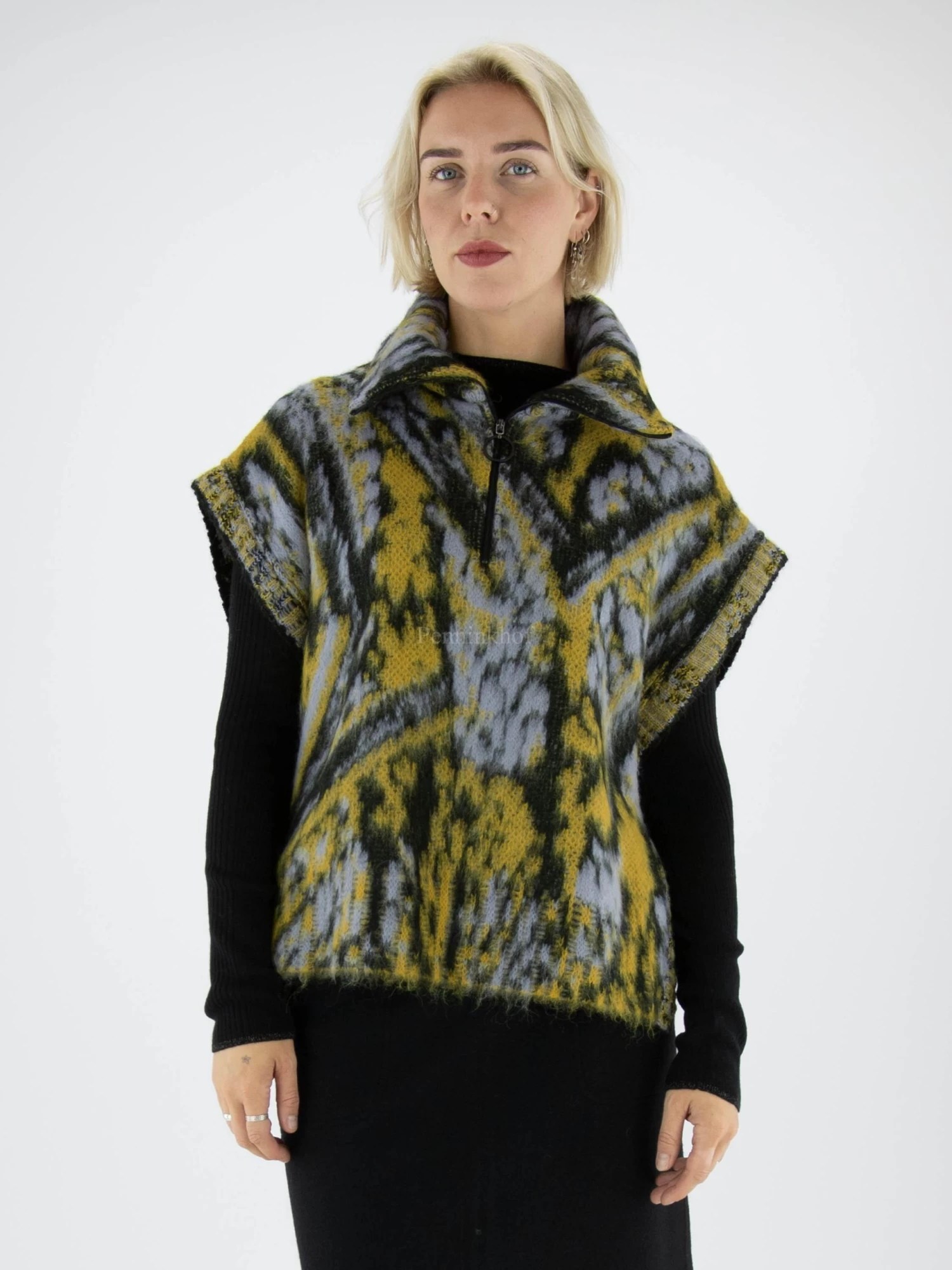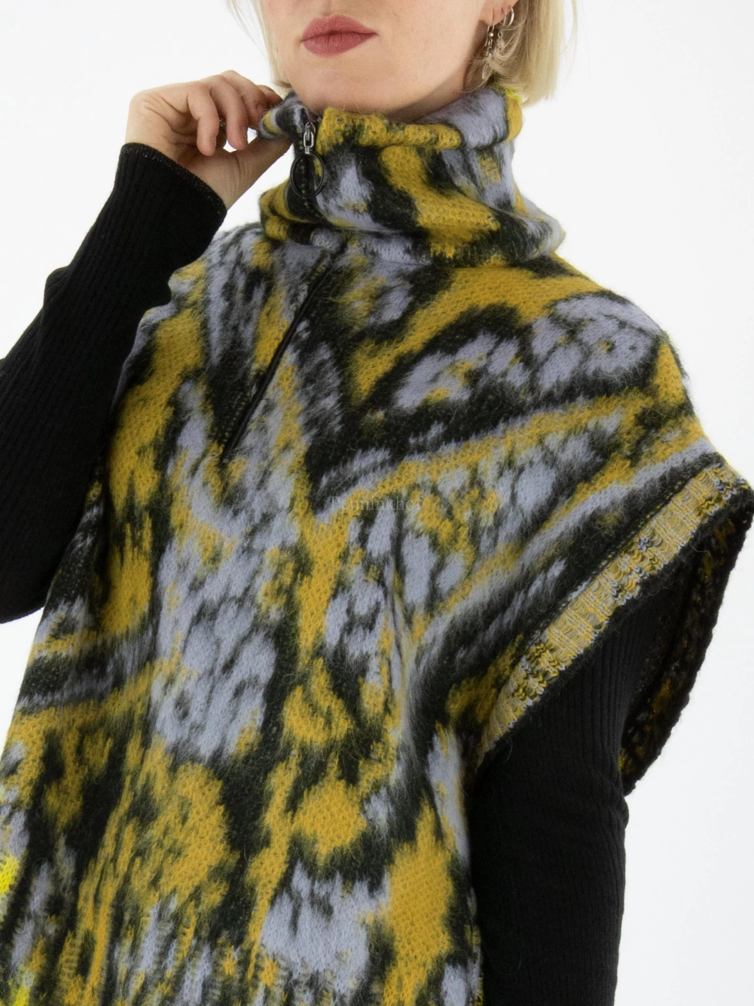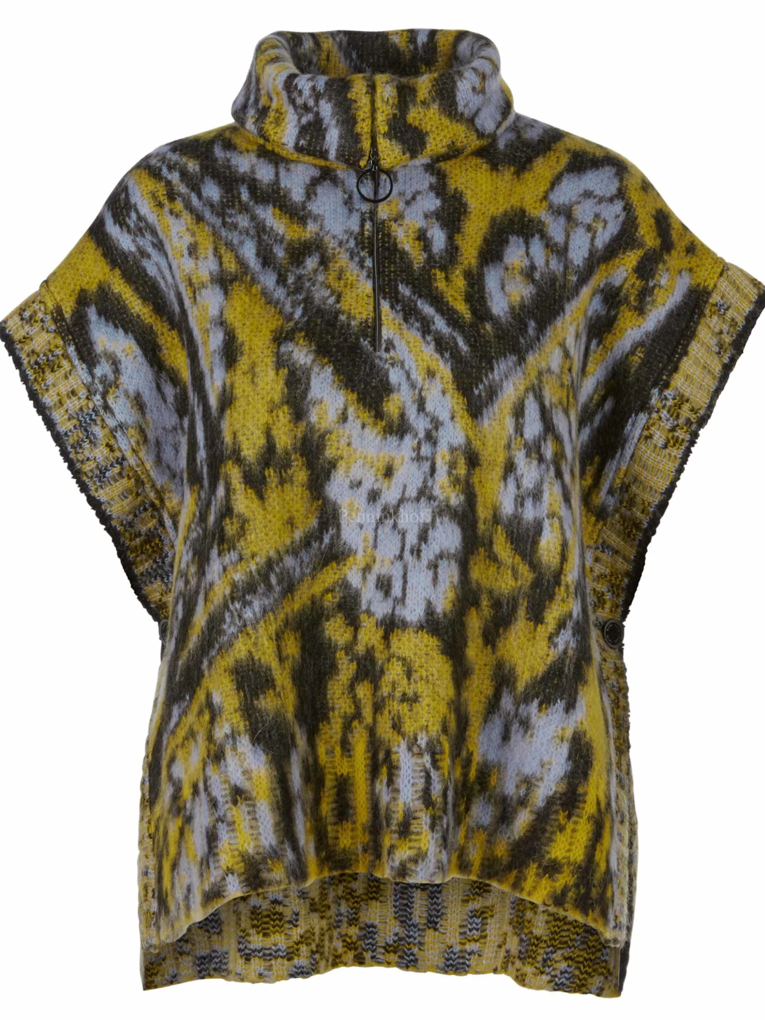 Een spencer Van Marc Cain in een print met de kleuren geel, lila en zwart. De spencer heeft een vallende col met een ritssluiting in het midden. Langs de zijkanten is de spencer met één knoopsluiting aan beide kanten gesloten. Deze spencer mag op de hand worden gewassen.