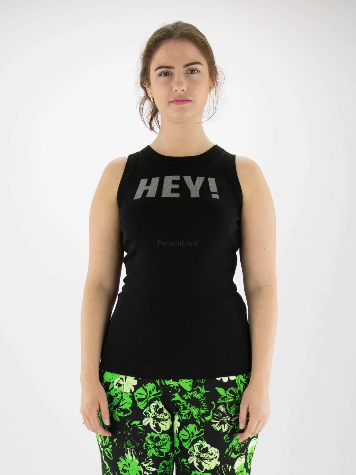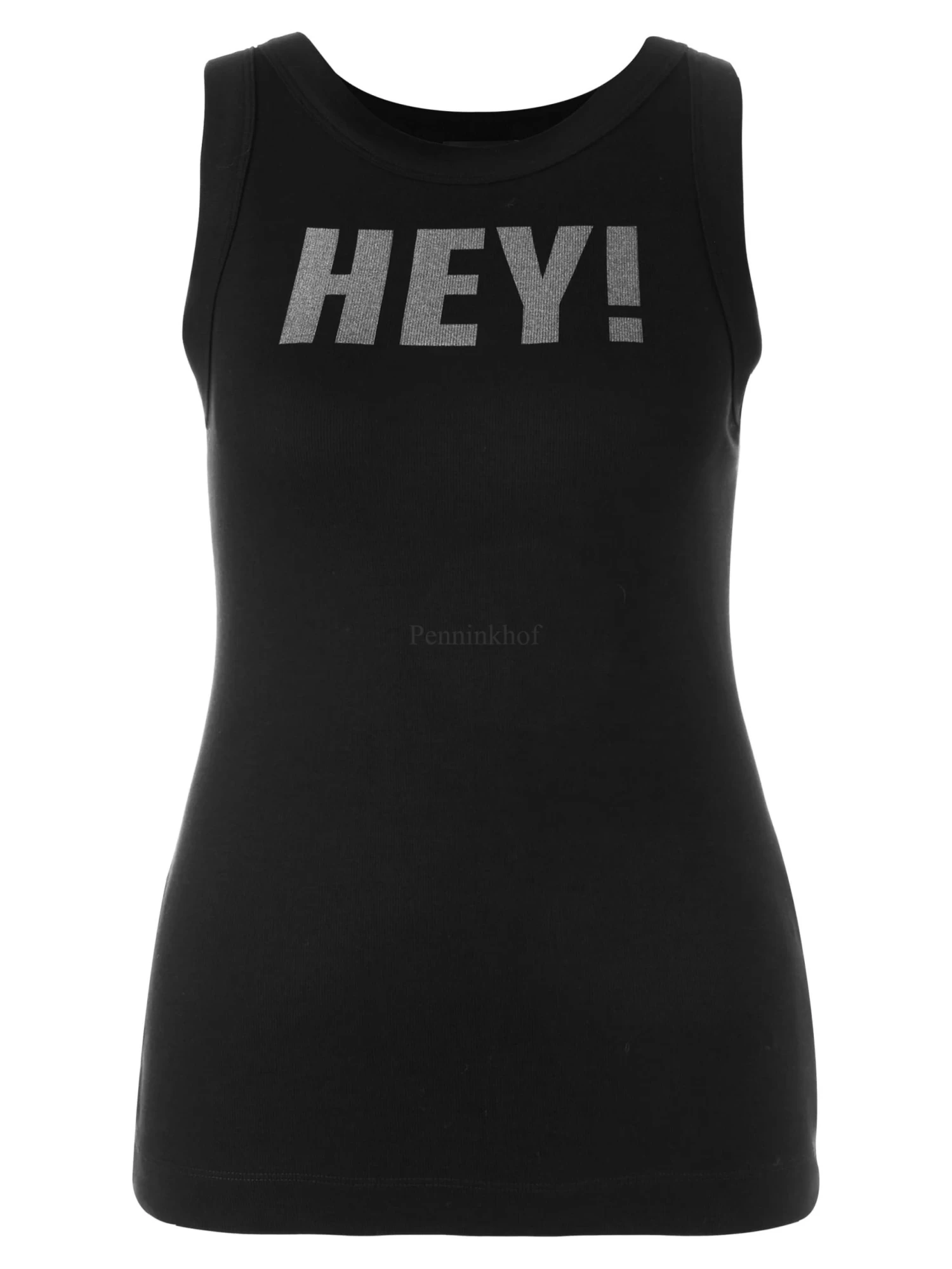 Een top van Marc Cain in de kleur zwart. Aan de voorkant is in een zilver metallic kleur het woord “HEY” geprint. De top heeft een ronde hals en mag op 30 graden worden gewassen.