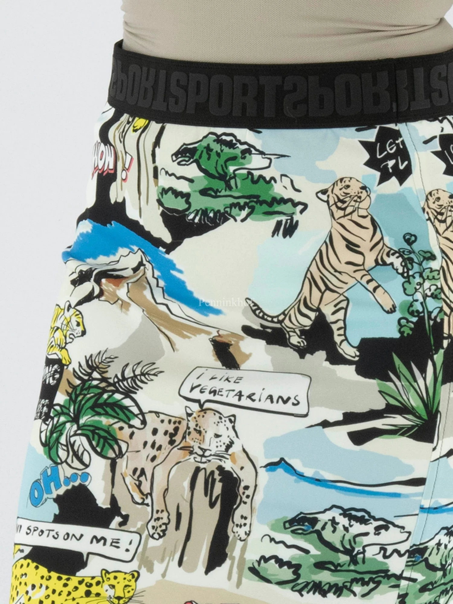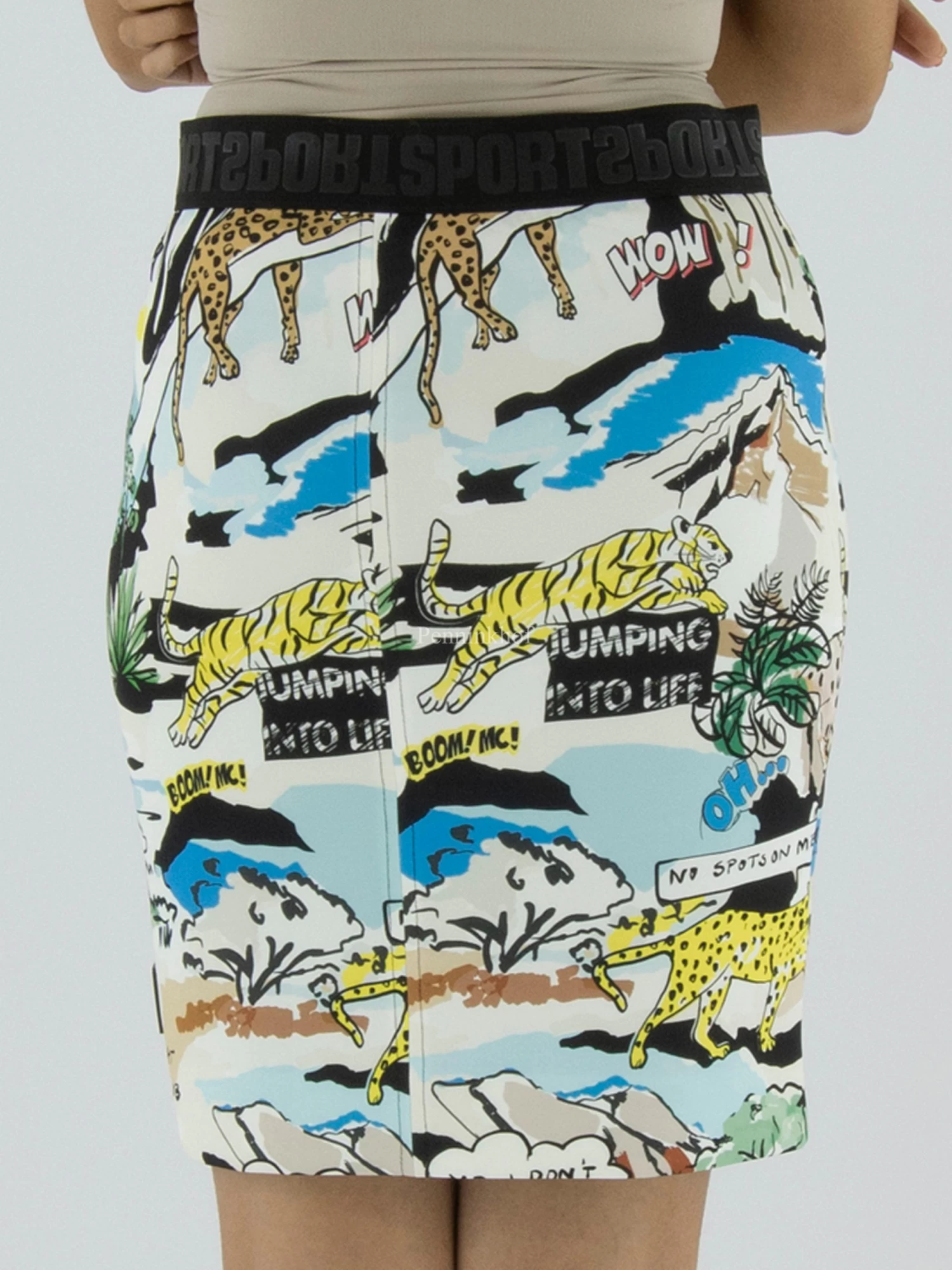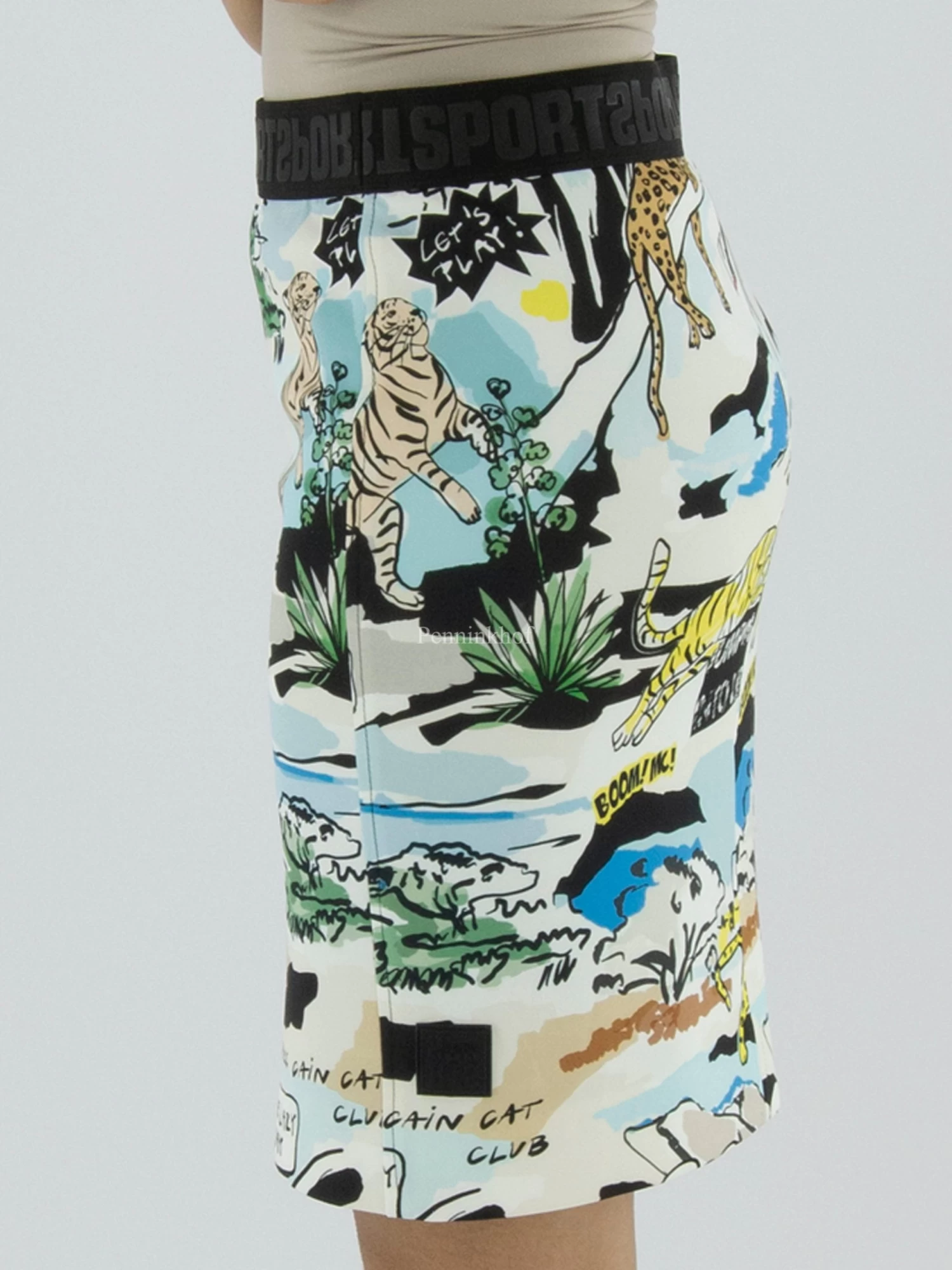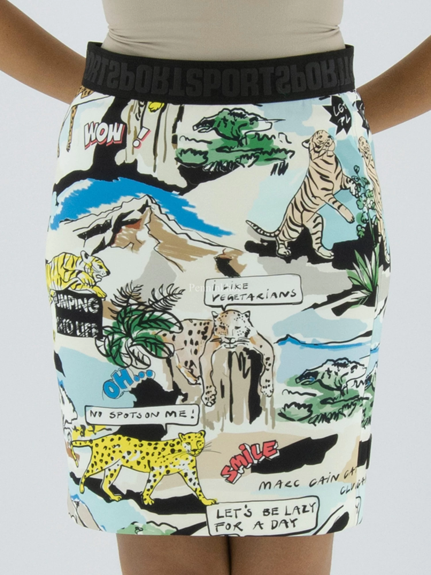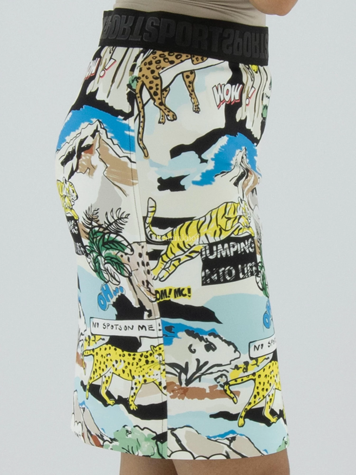 Een rok van Marc Cain in een cartoonprint met de hoofdkleuren blauw, geel, zwart en groen op een roomwitte achtergrond. In de taille is een elastieken band. De rok is gevoerd en mag op 30 graden worden gewassen.