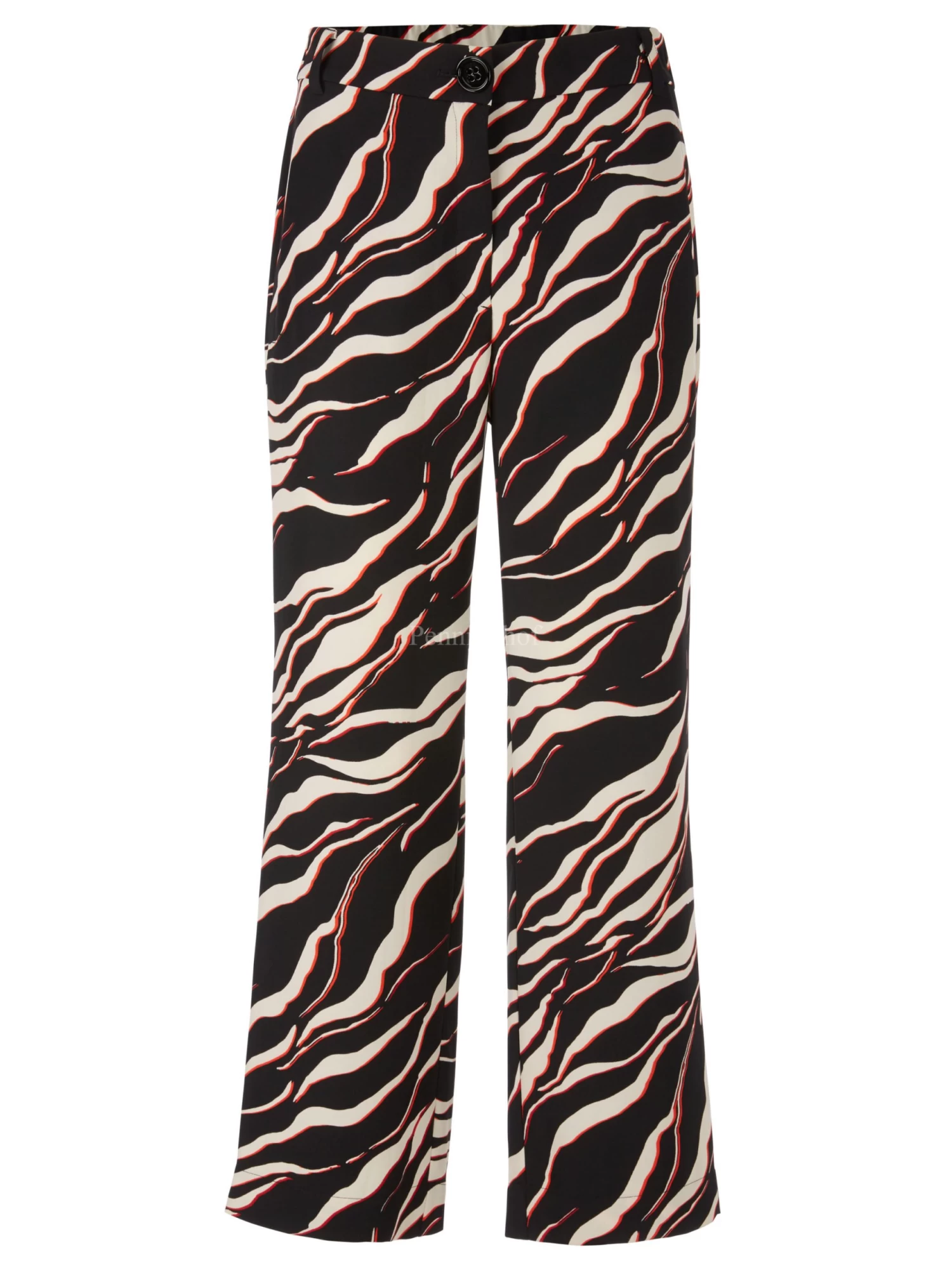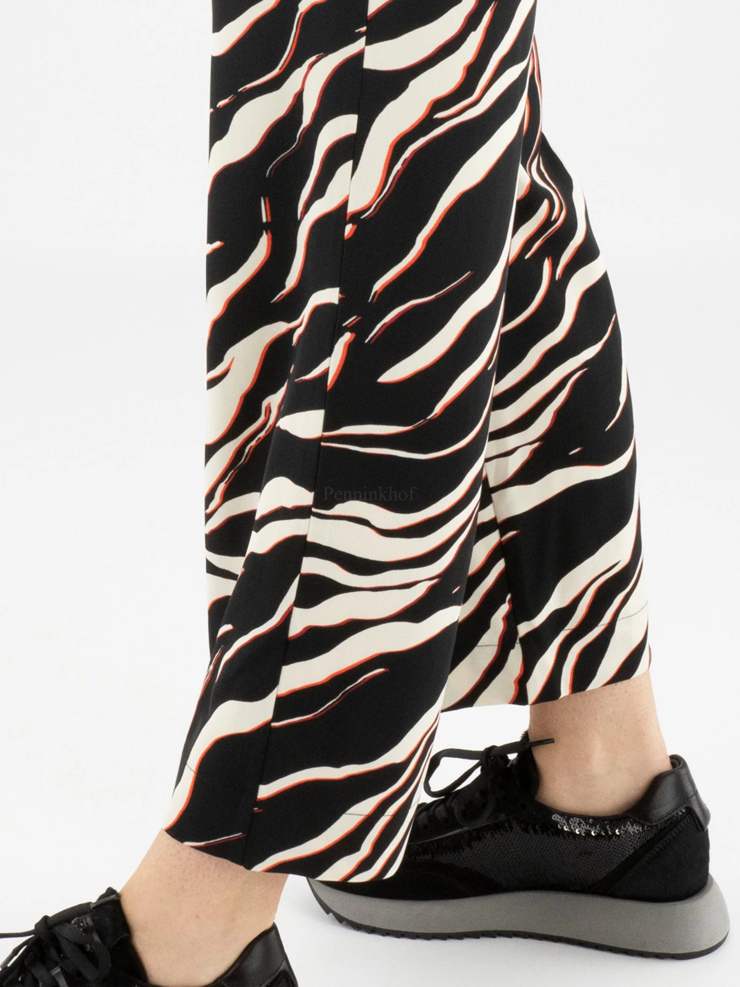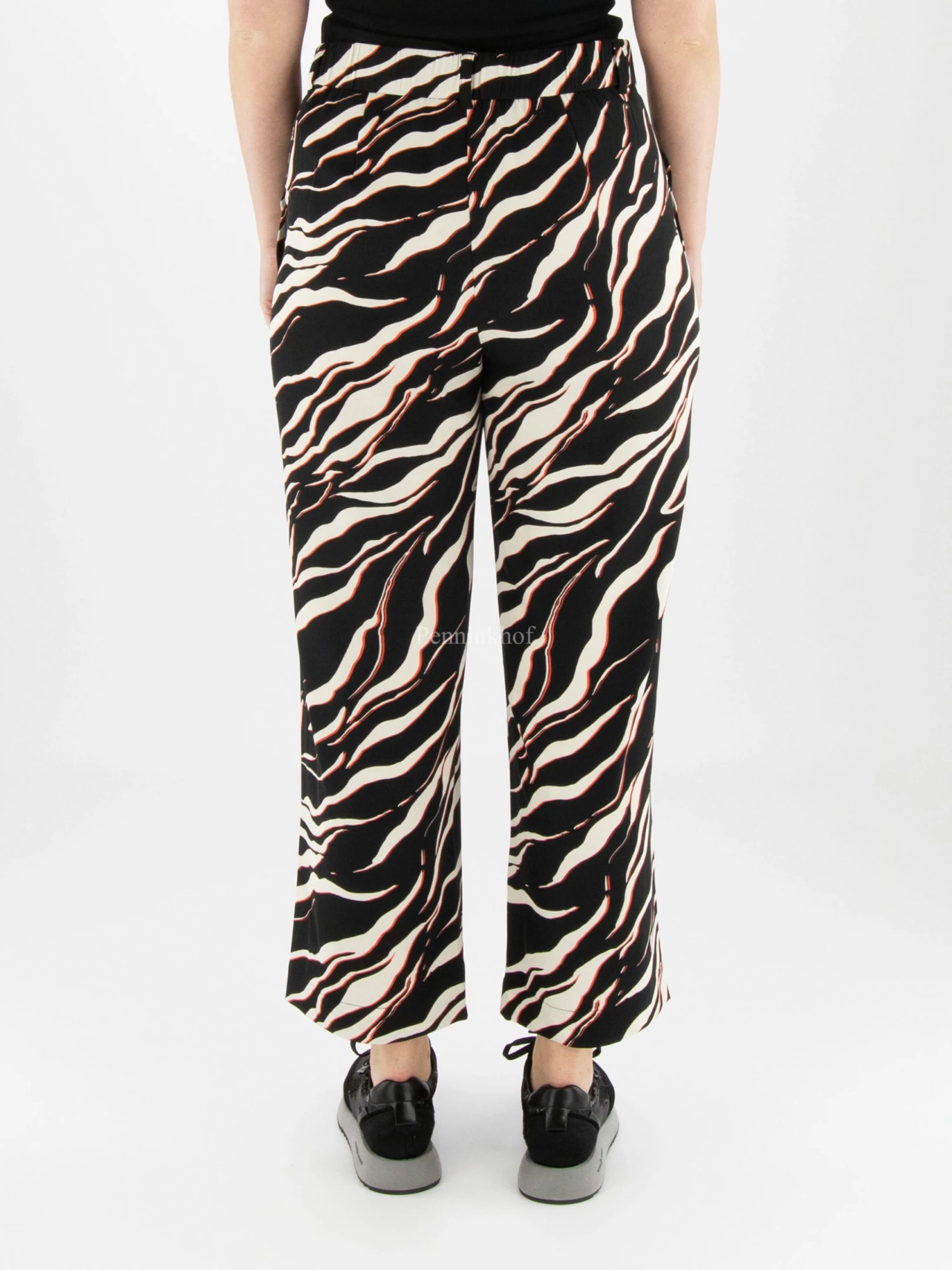 Een recht gesneden broek van Marc Cain in een grafische zebraprint met de kleuren rood en zwart op een roomwitte achtergrond. Aan de achterkant van de broek is in de taille een elastieken band. De broek heeft steekzakken en mag op 30 graden worden gewassen.