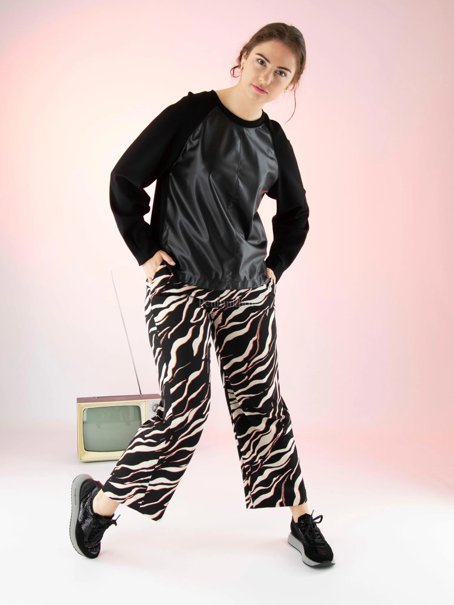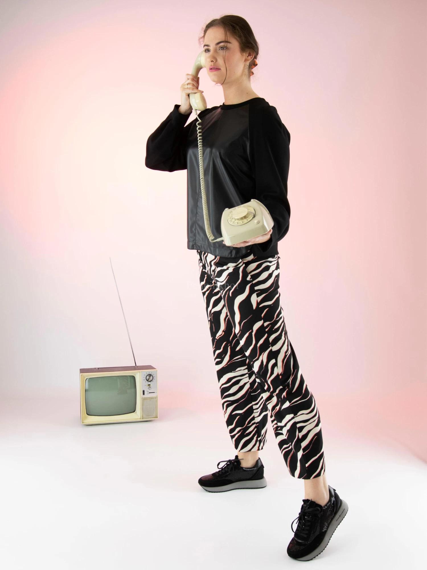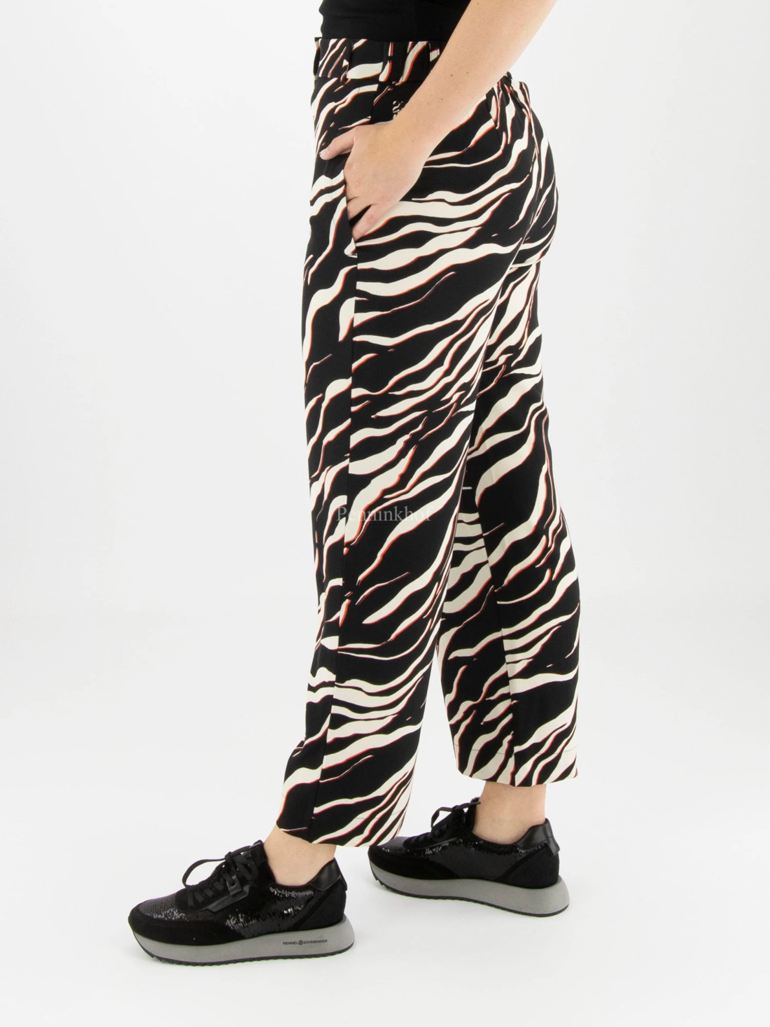 Een recht gesneden broek van Marc Cain in een grafische zebraprint met de kleuren rood en zwart op een roomwitte achtergrond. Aan de achterkant van de broek is in de taille een elastieken band. De broek heeft steekzakken en mag op 30 graden worden gewassen.