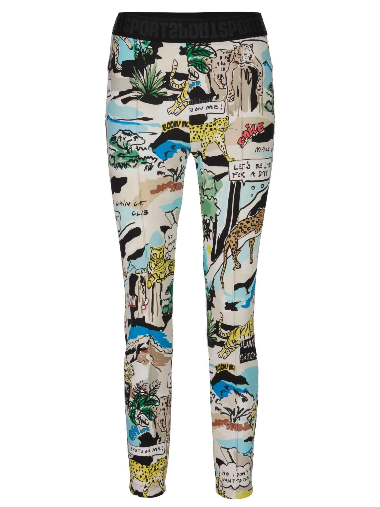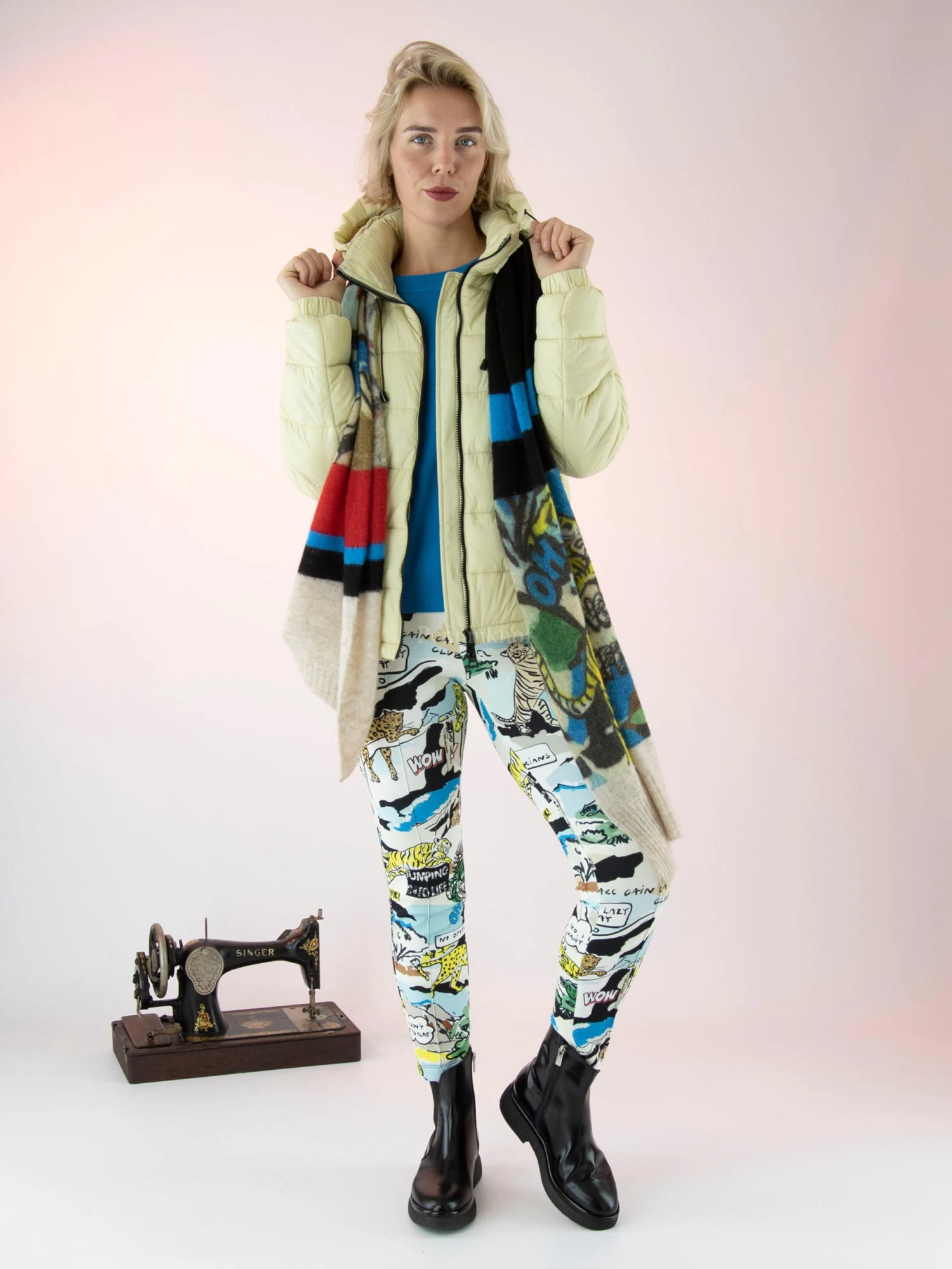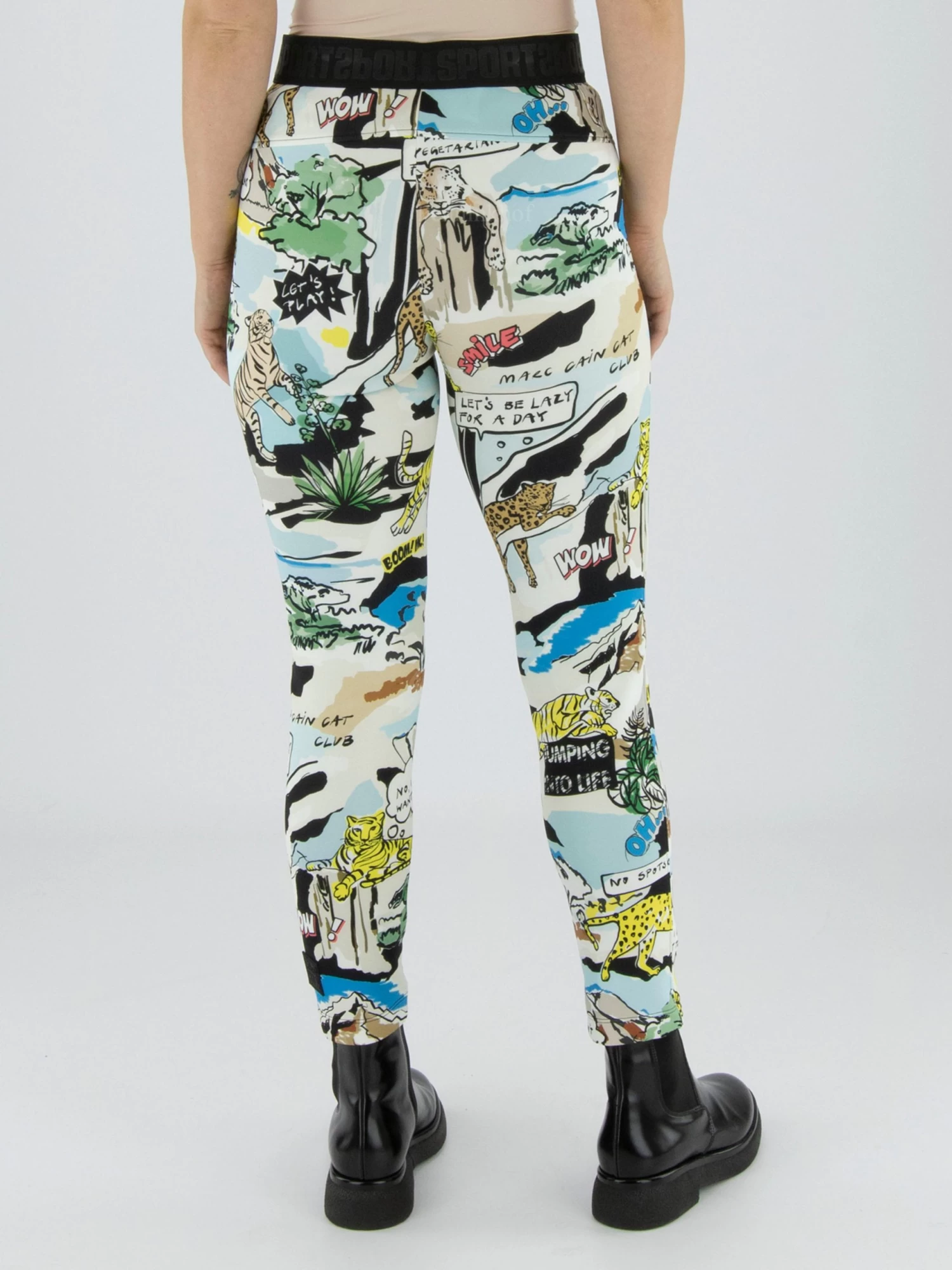 Een broek van Marc Cain in een cartoonprint met de hoofdkleuren blauw, geel, zwart en groen op een roomwitte achtergrond. In de taille is een elastieken band. In het midden van de pijpen is een stiknaad.Deze broek mag op 30 graden worden gewassen.