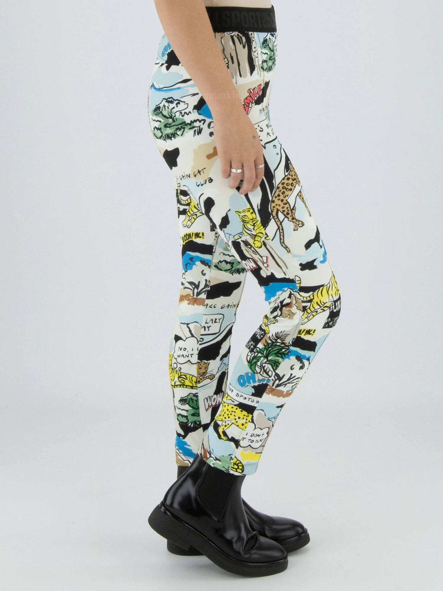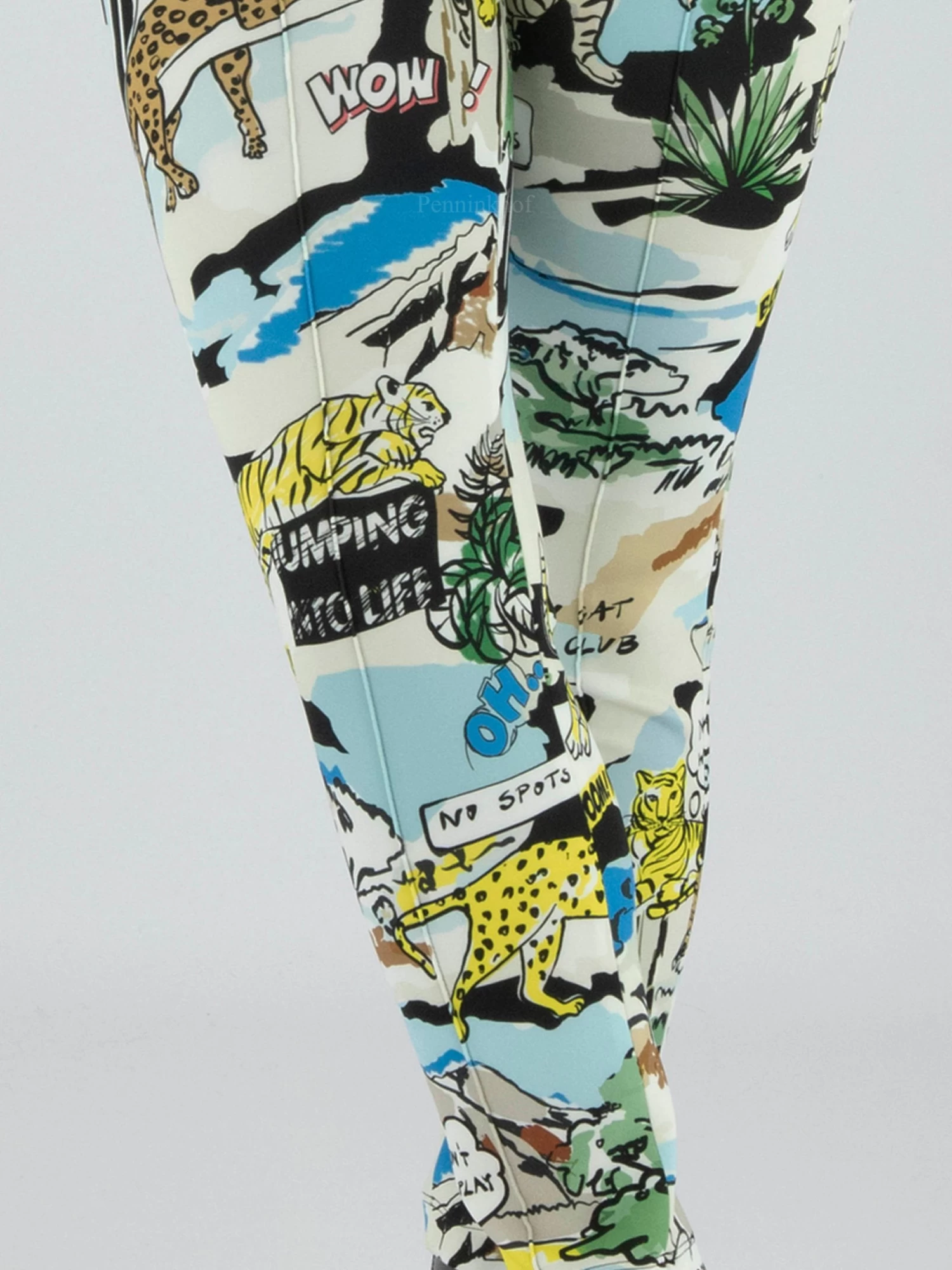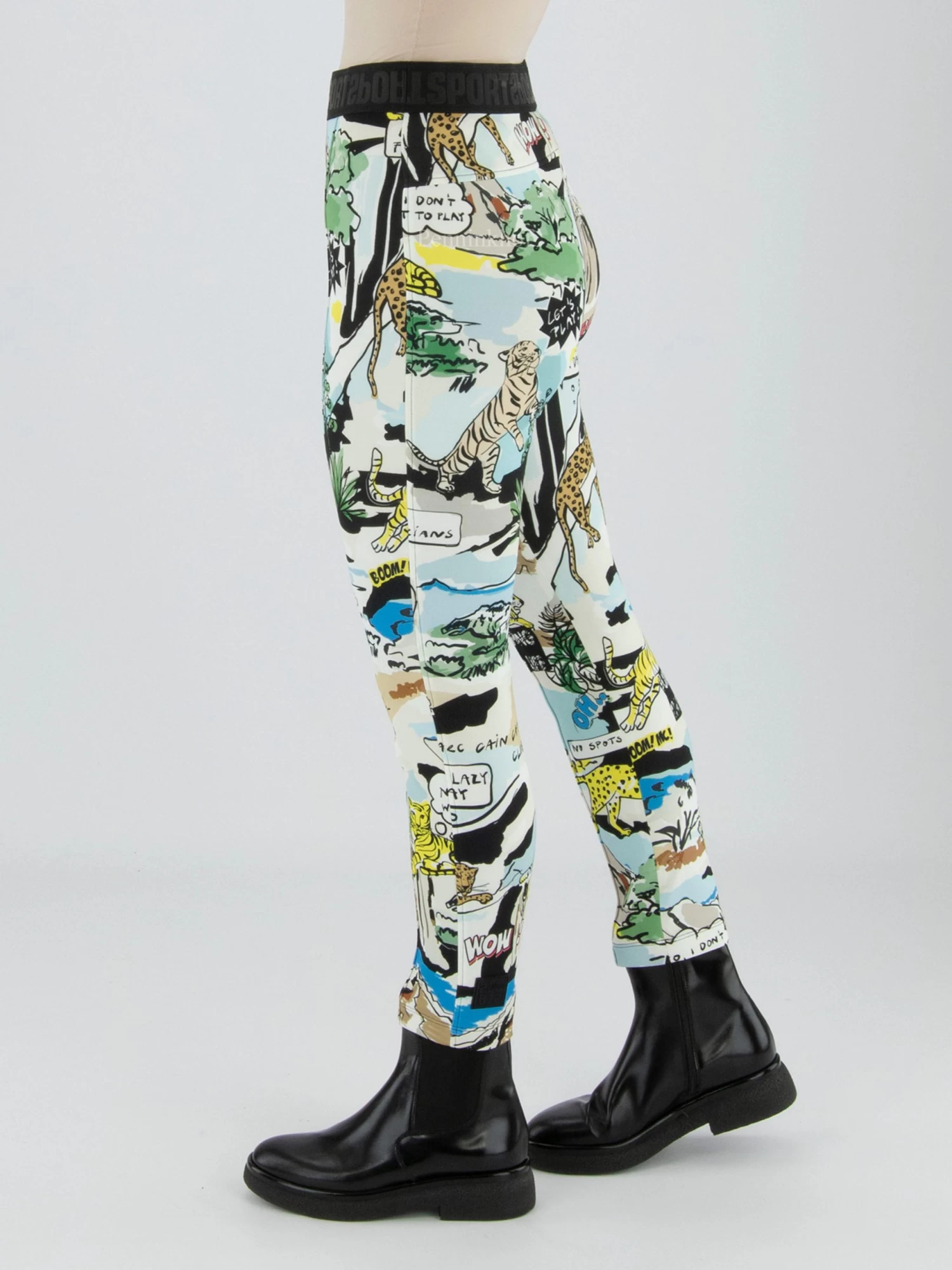 Een broek van Marc Cain in een cartoonprint met de hoofdkleuren blauw, geel, zwart en groen op een roomwitte achtergrond. In de taille is een elastieken band. In het midden van de pijpen is een stiknaad.Deze broek mag op 30 graden worden gewassen.