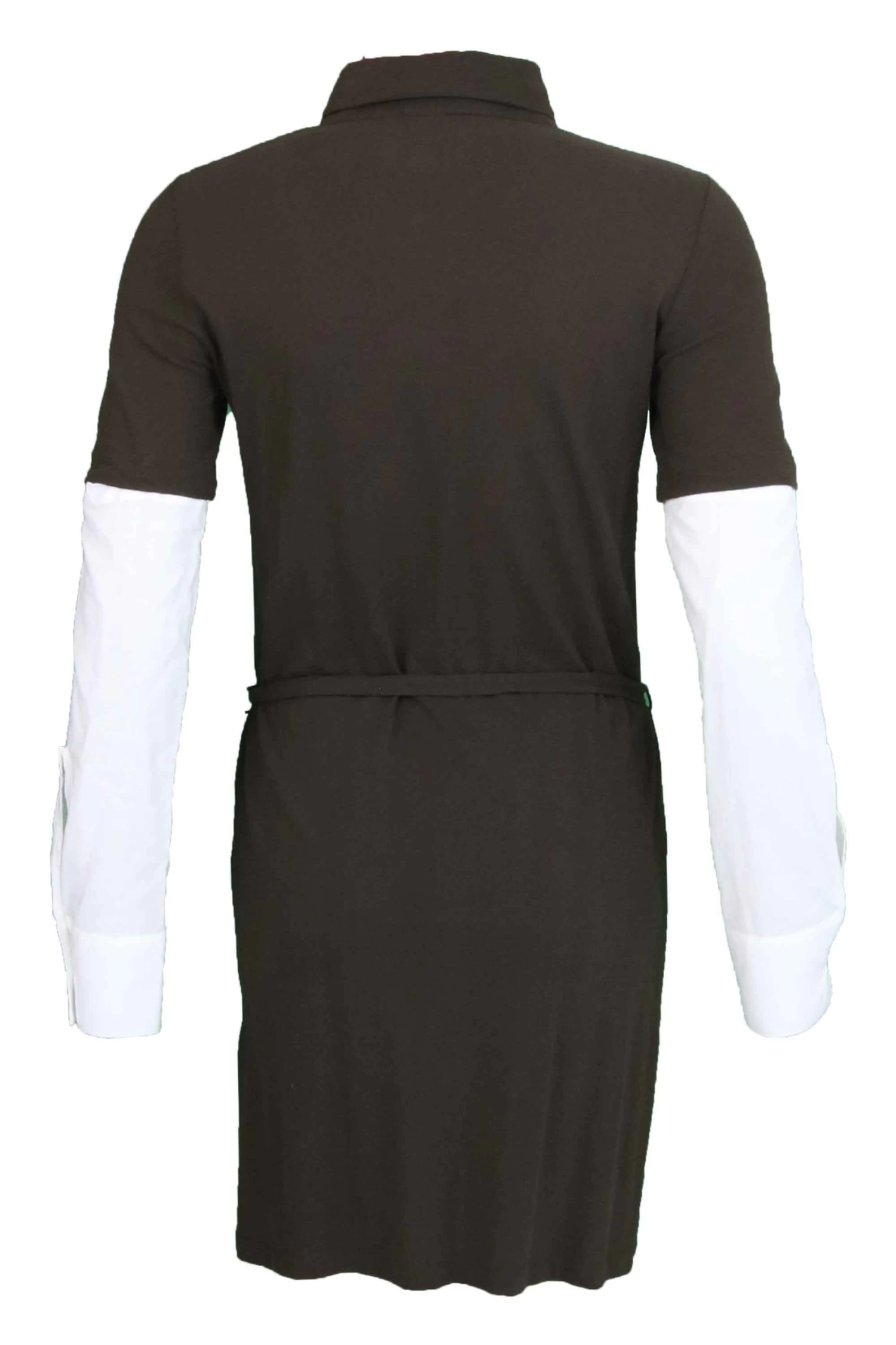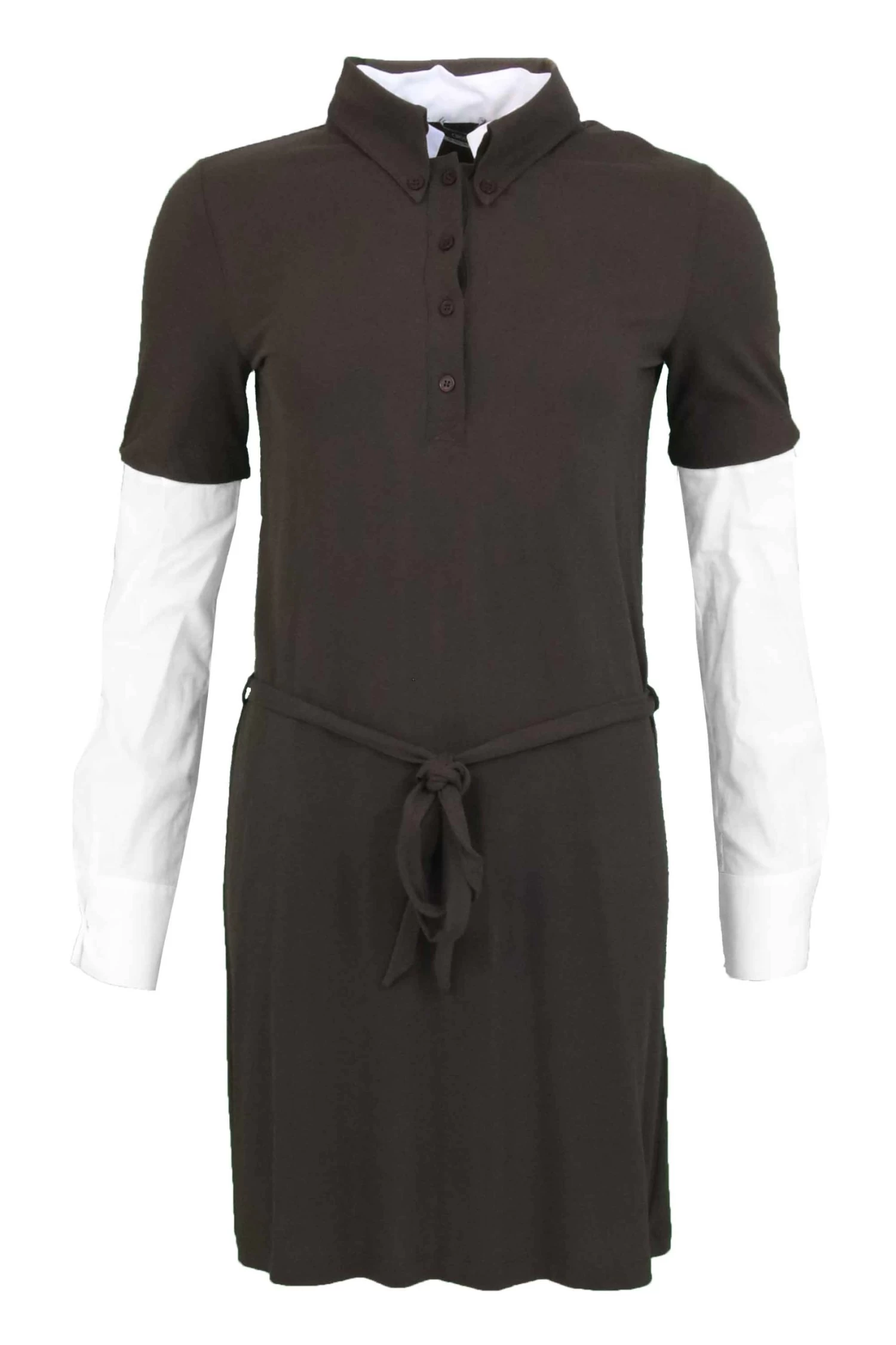 Een jurk van Orwell in de kleur bruin. In de taille is een lint ceintuur van dezelfde stof als de jurk. De hals is in een polo model met een in de kraag een tweede witte stof. Vanuit de korte mouwen zijn witte blouse mouwen met manchetten. Deze jurk mag op 30 graden worden gewassen.