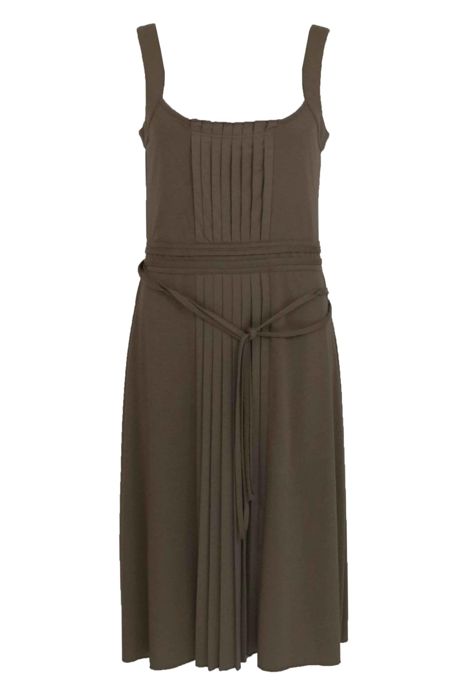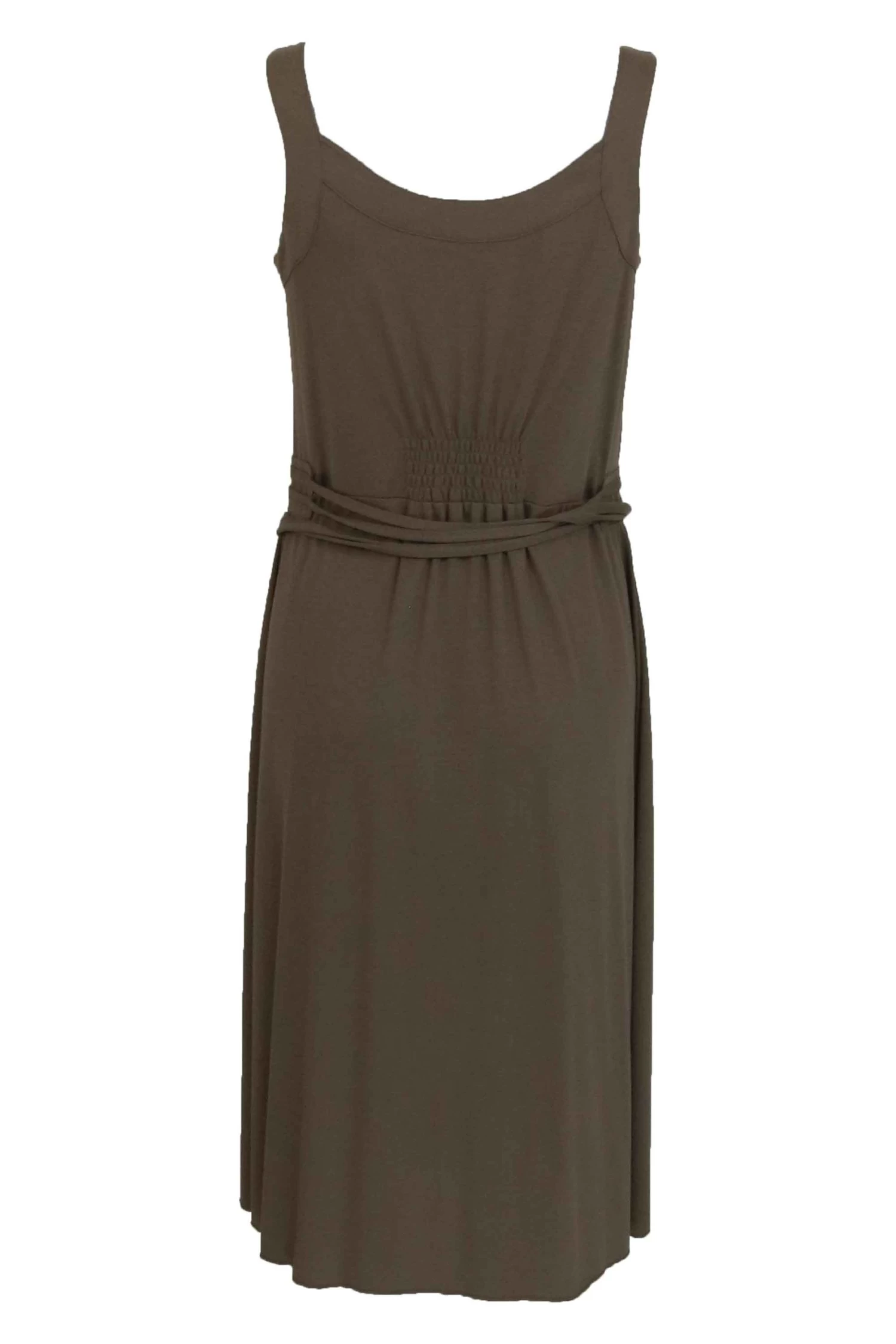 Een jurk van Orwell in de kleur bruin. In de taille is een taille band met gestikte biezen en een lint ceintuur van dezelfde stof als de jurk. In het midden aan de voorzijde is de stof geplisseerd. Deze jurk mag op 30 graden worden gewassen.