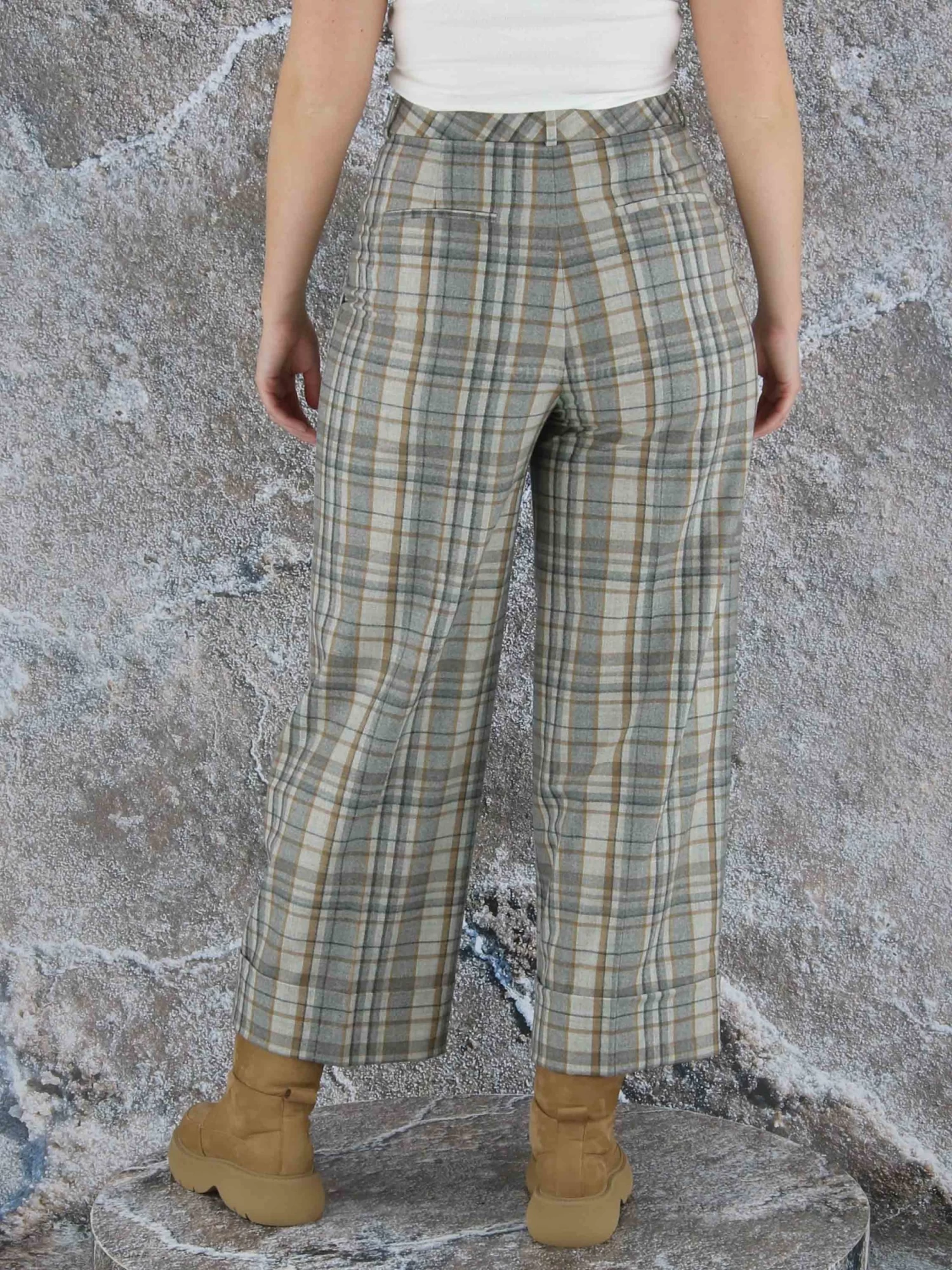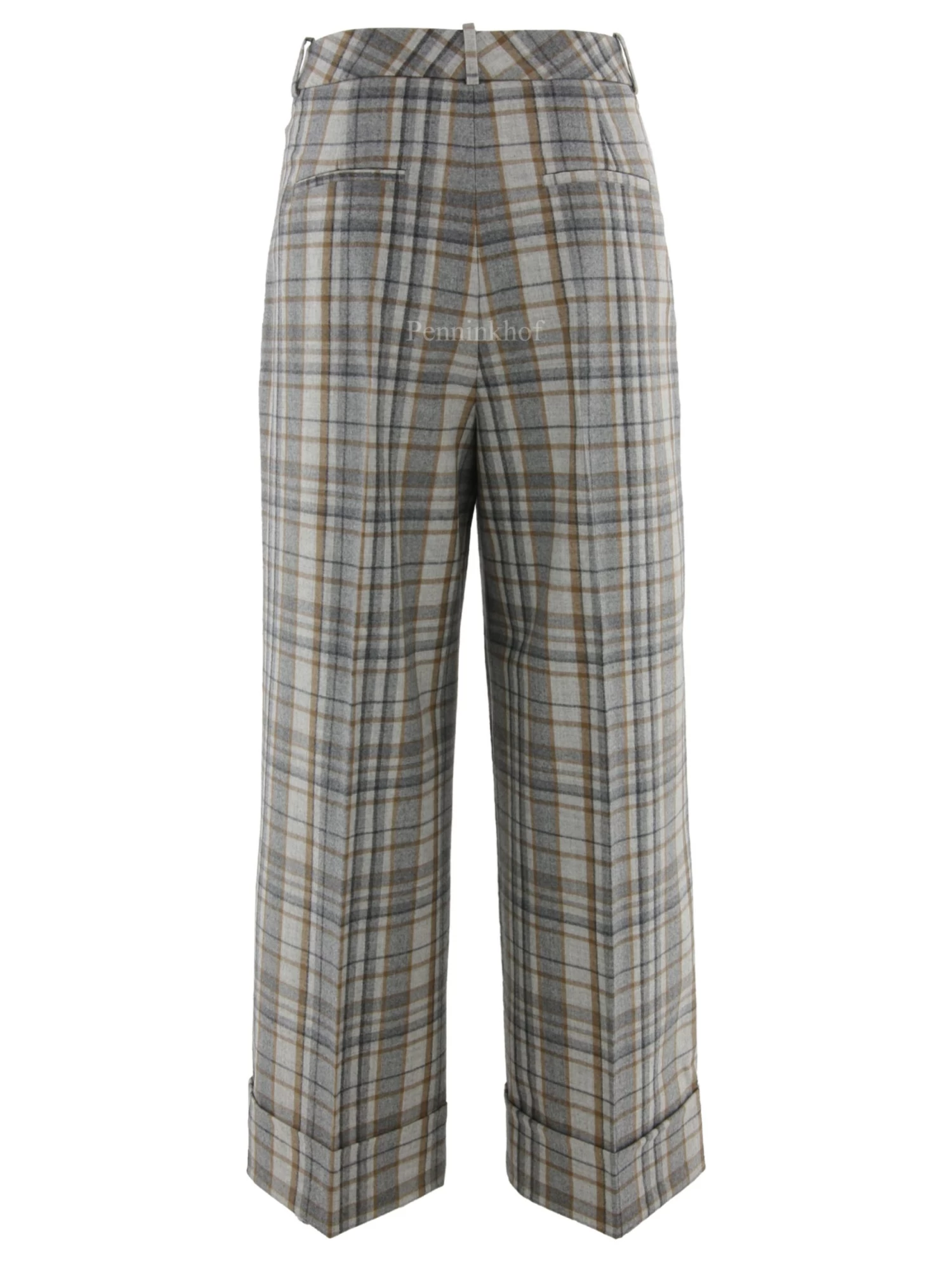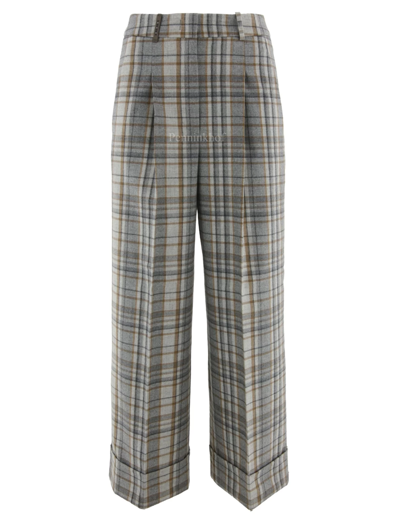Een wijde broek van Peserico in een ruitpatroon met meerdere tinten grijs en camel. Vanuit de taille zijn er enkele bandplooien. De broek heeft steekzakken en aan de onderkant van de pijpen is een brede omslag. Deze broek mag op de hand worden gewassen.