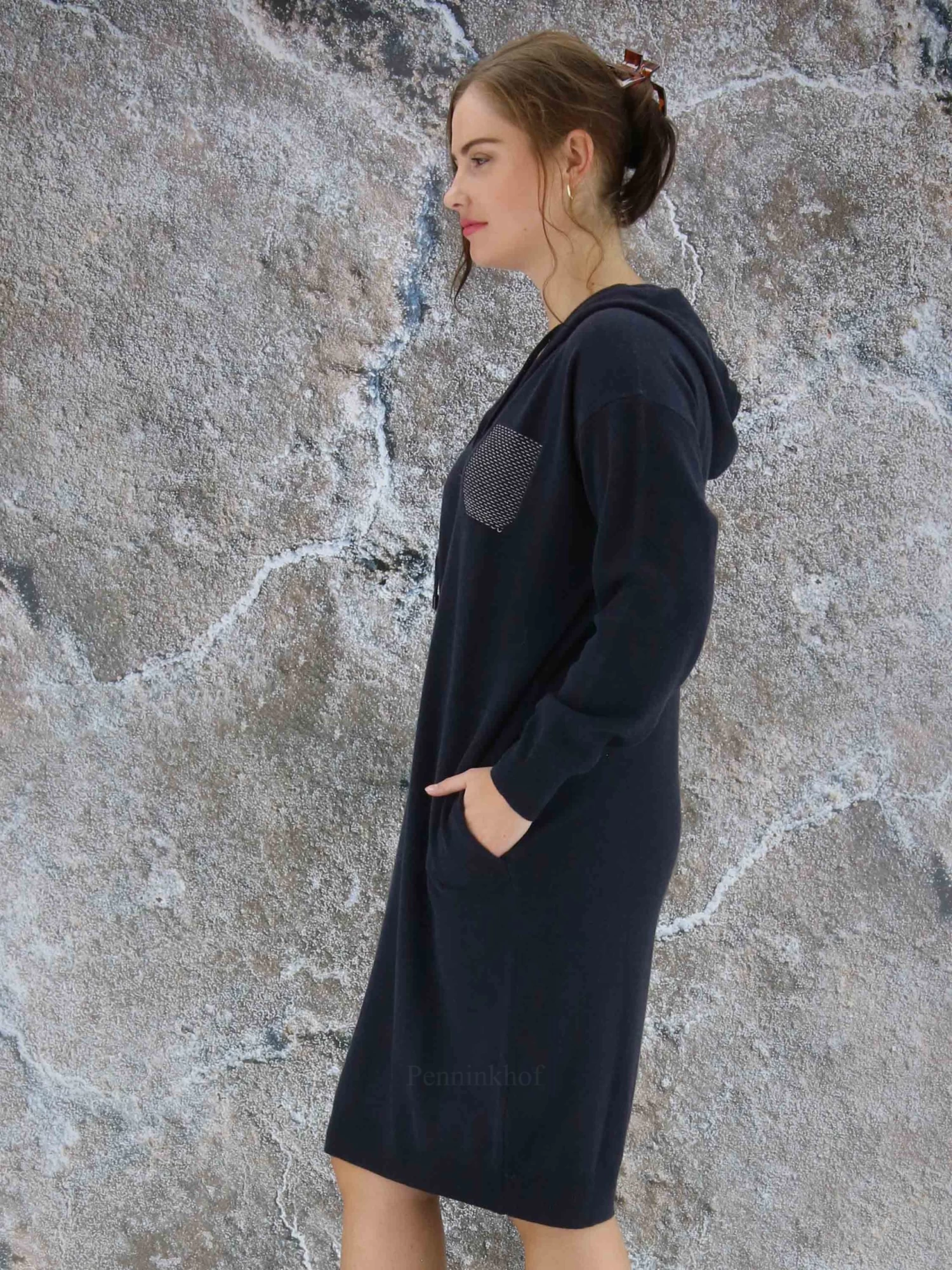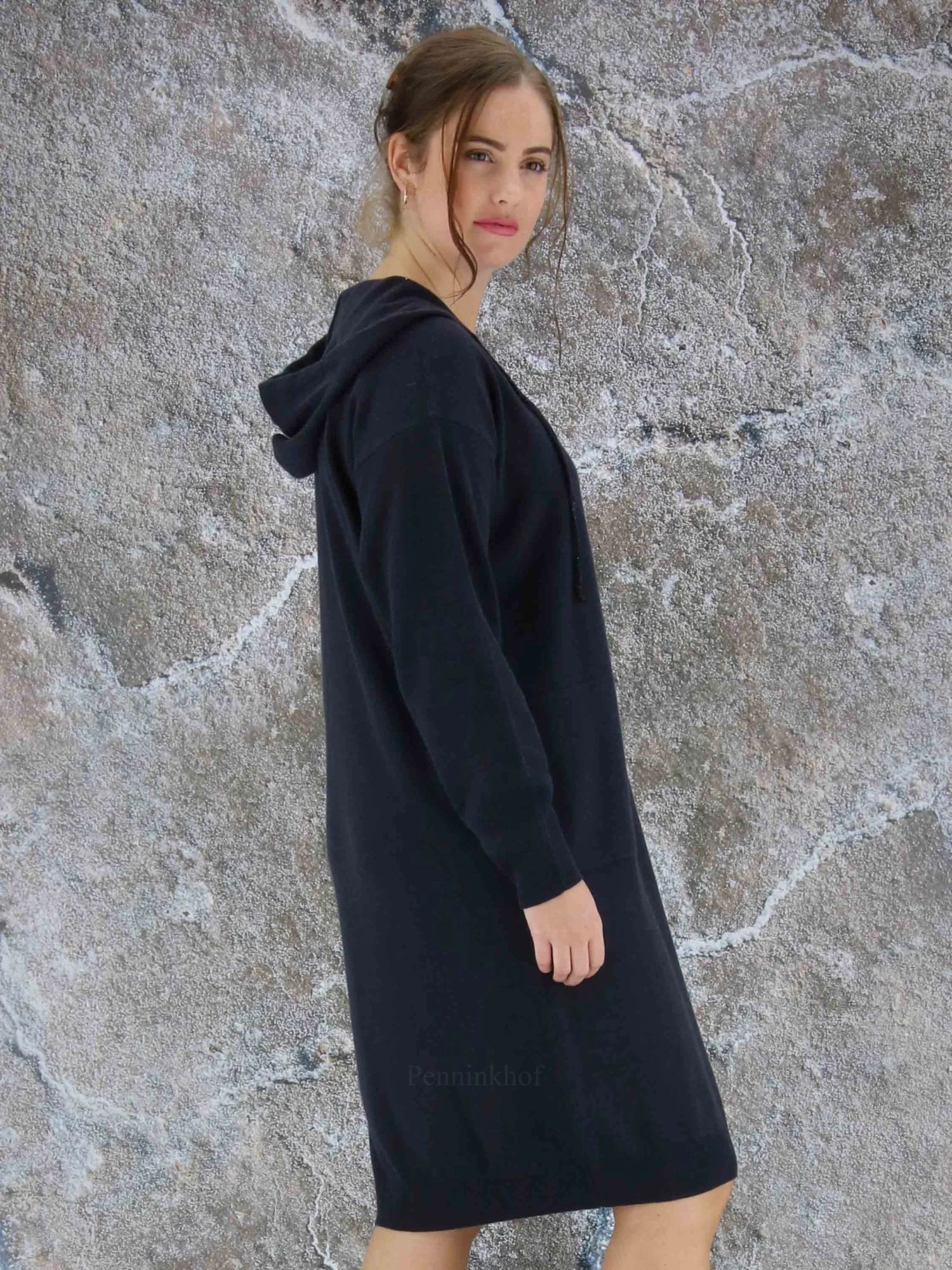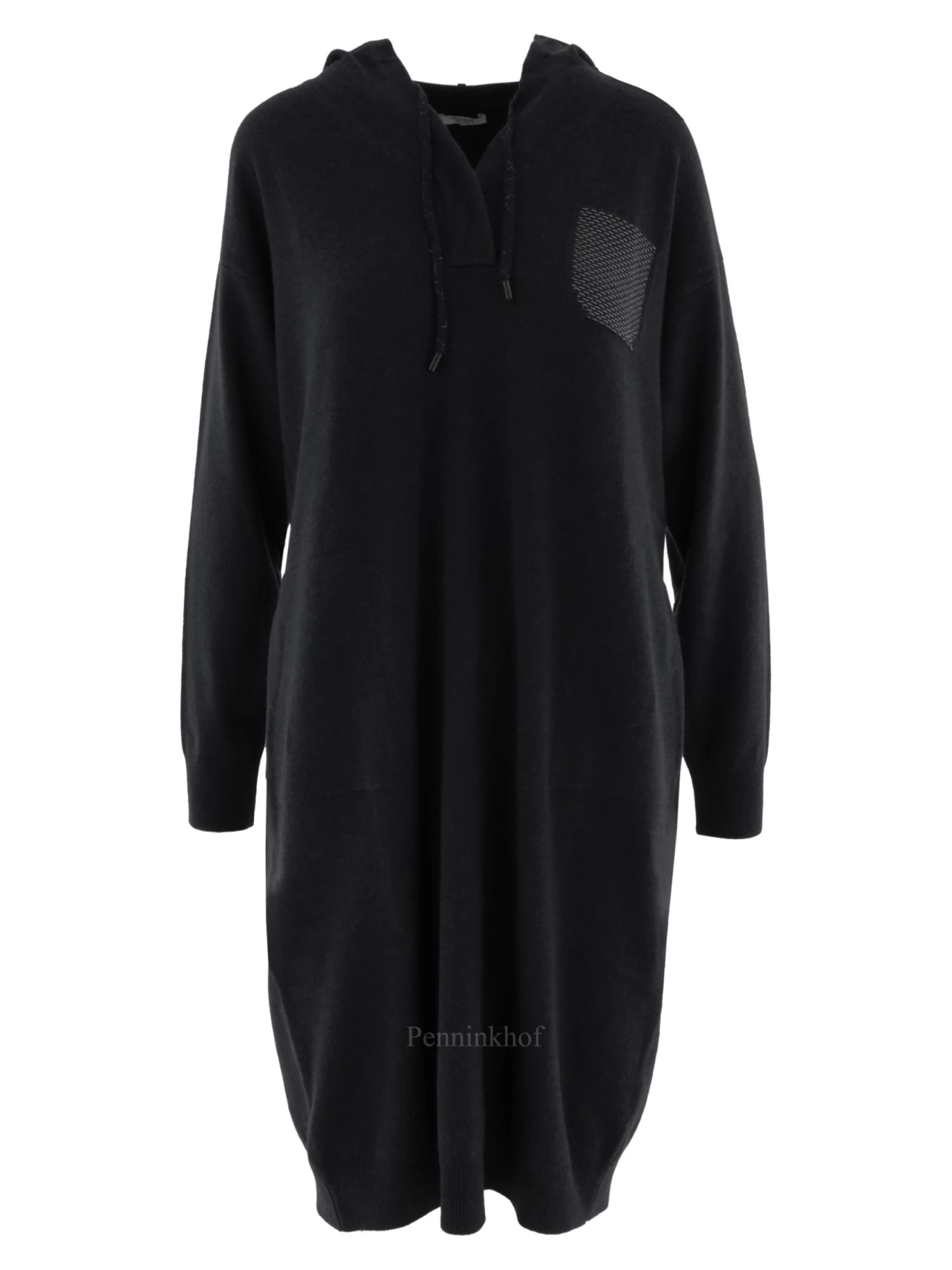 Een luxe jurk in de kleur antraciet. De jurk heeft een V – Hals en lange mouwen. In de rand van de capuchon is een koord waarmee de capuchon kan worden aangetrokken. Aan de voorzijde is met een strasdraad een decoratieve borstzak geweven. Aan de onderkant van de jurk en aan de uiteinden van de mouwen is een fijn geribbelde tricot boord. Deze jurk mag op de hand worden gewassen.
