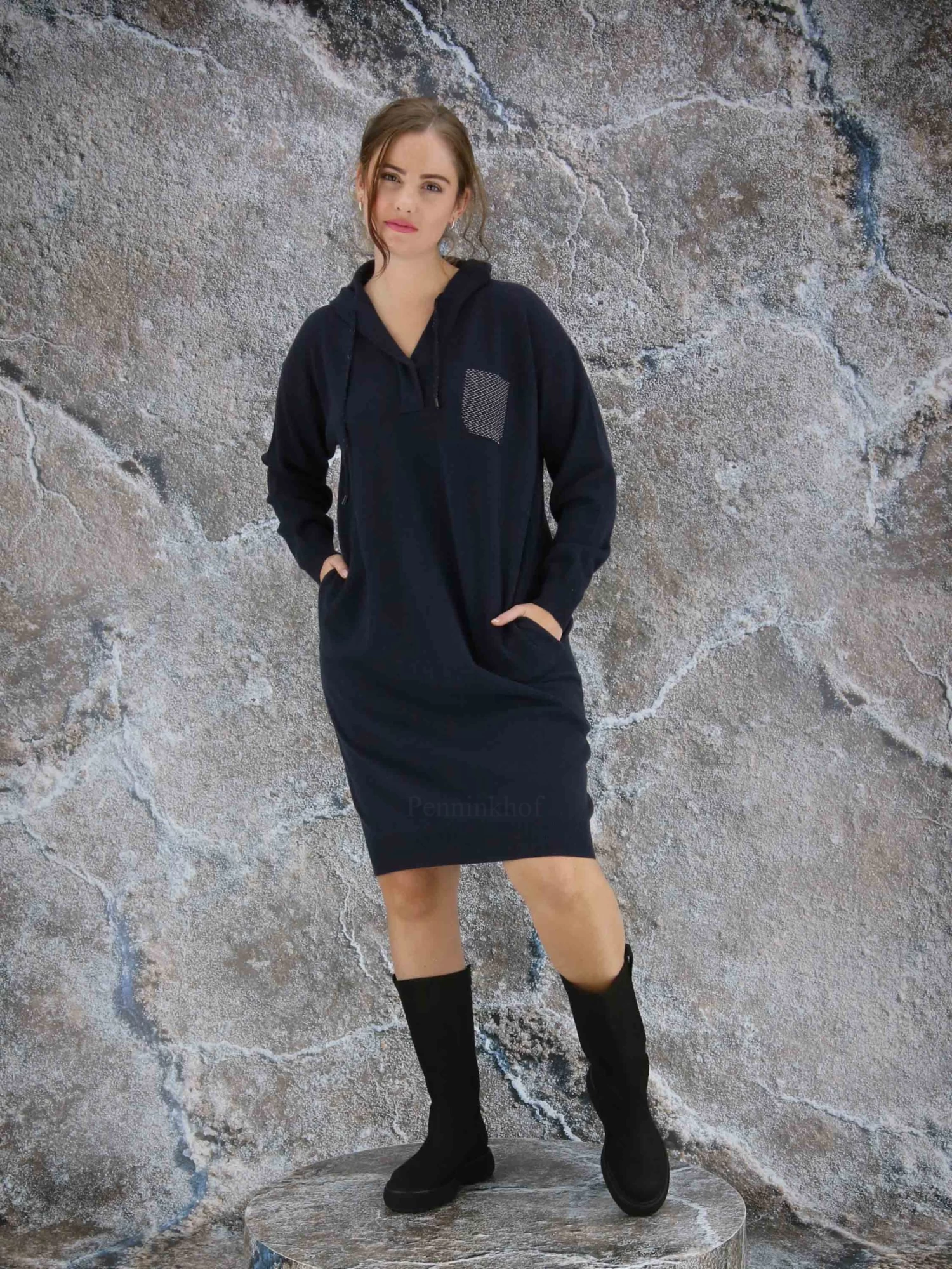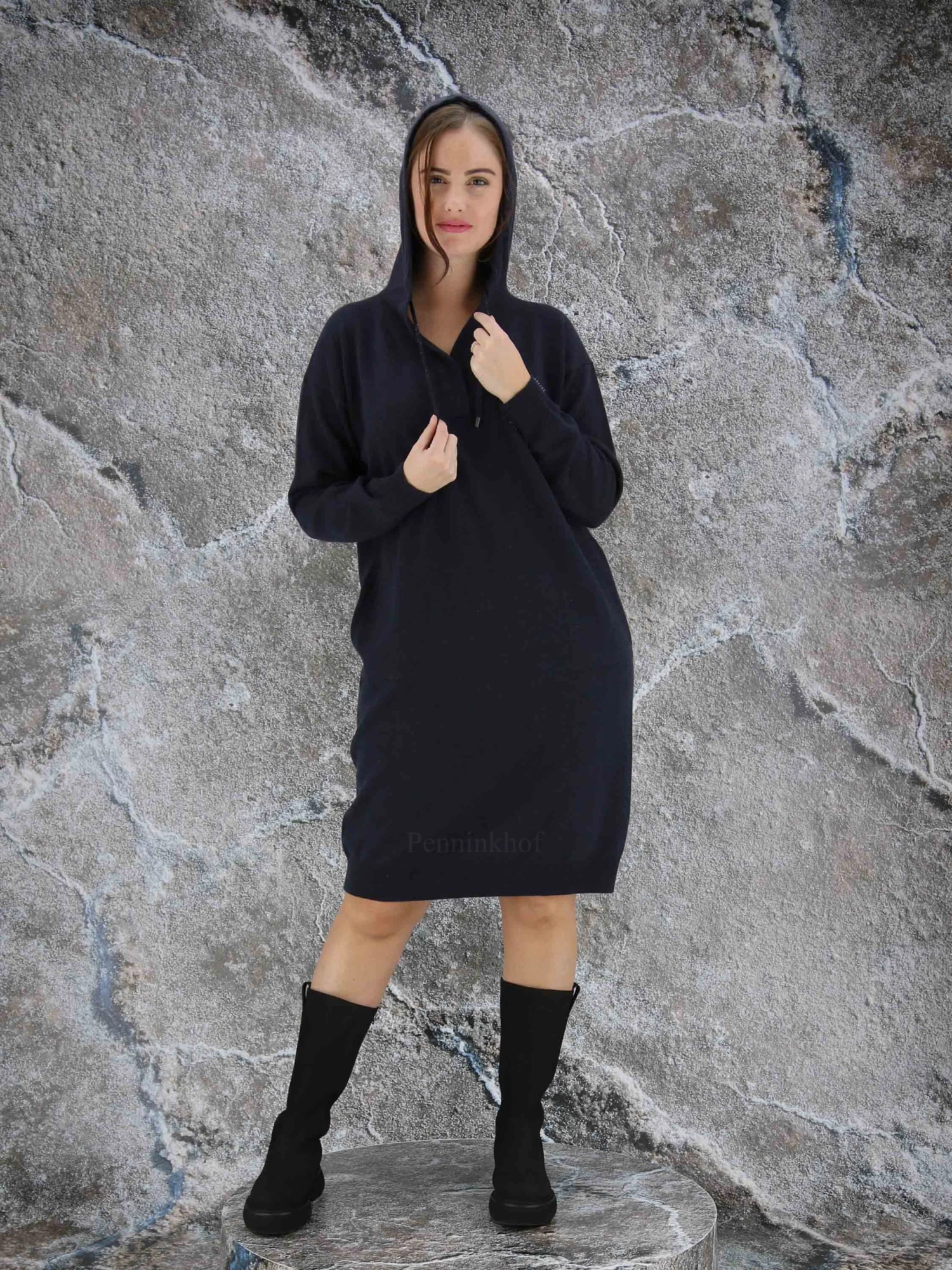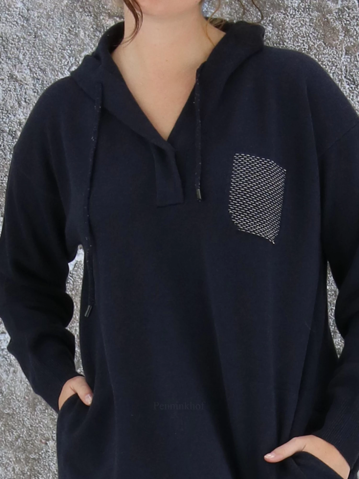 Een luxe jurk in de kleur antraciet. De jurk heeft een V – Hals en lange mouwen. In de rand van de capuchon is een koord waarmee de capuchon kan worden aangetrokken. Aan de voorzijde is met een strasdraad een decoratieve borstzak geweven. Aan de onderkant van de jurk en aan de uiteinden van de mouwen is een fijn geribbelde tricot boord. Deze jurk mag op de hand worden gewassen.