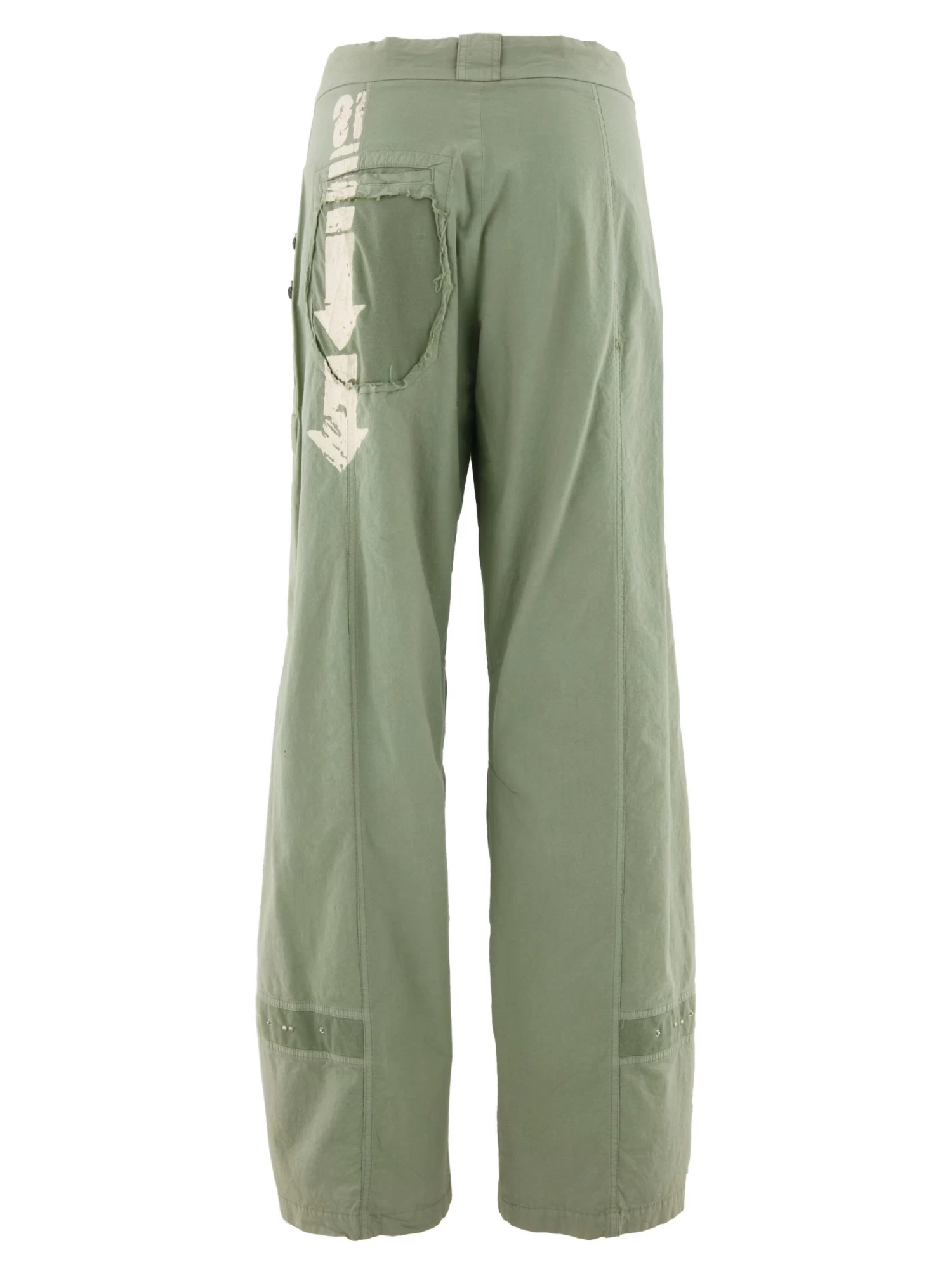 Een broek van Pianura Studio in een zachte khaki kleur. In het midden van de pijpen is een brede bies met studs en metalen ringen. Aan de voorzijde zijn dubbele steekzakken. Aan de rechter achterzijde is een roomwitte opdruk met pijlen. Deze broek mag op 30 graden worden gewassen.
