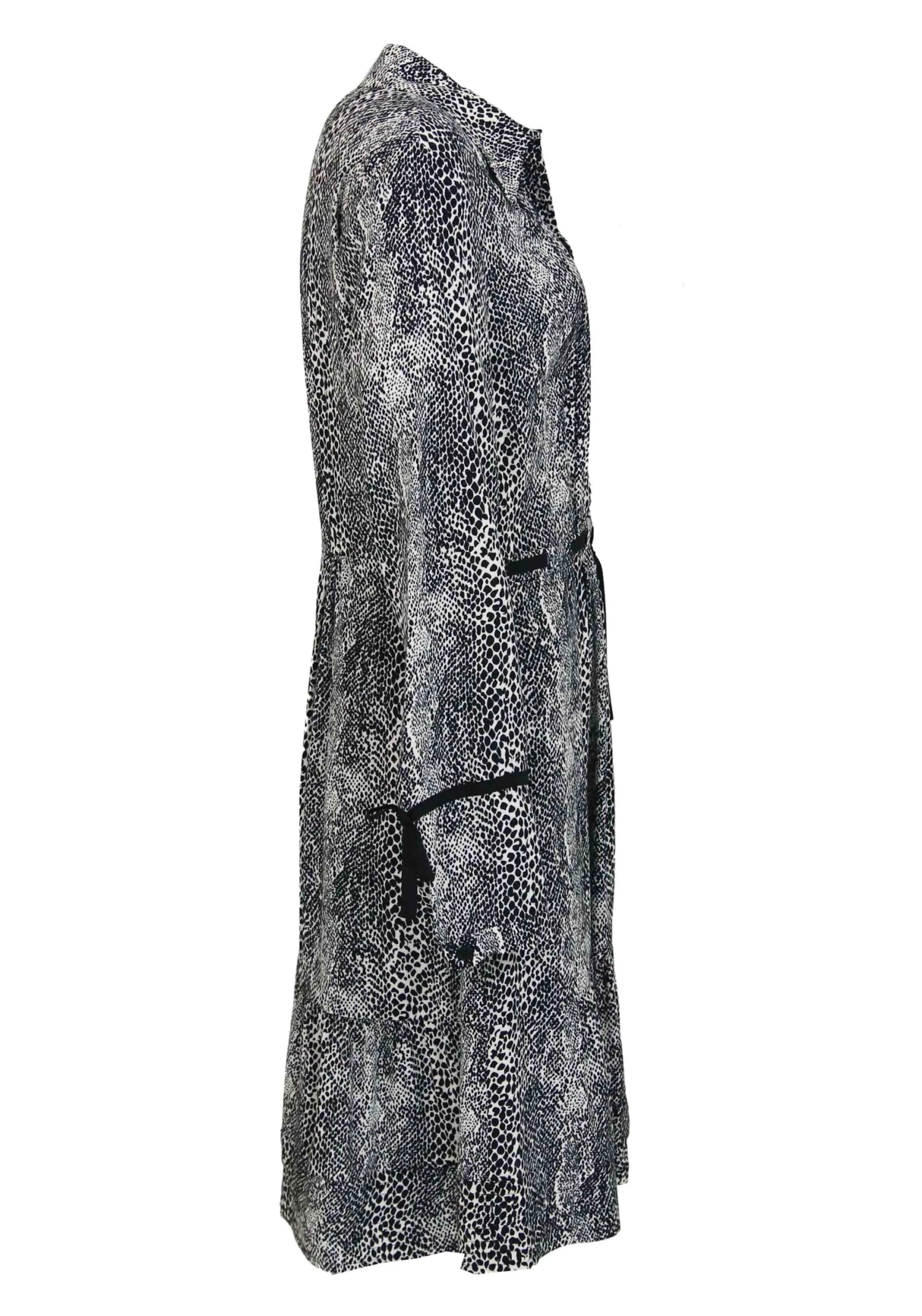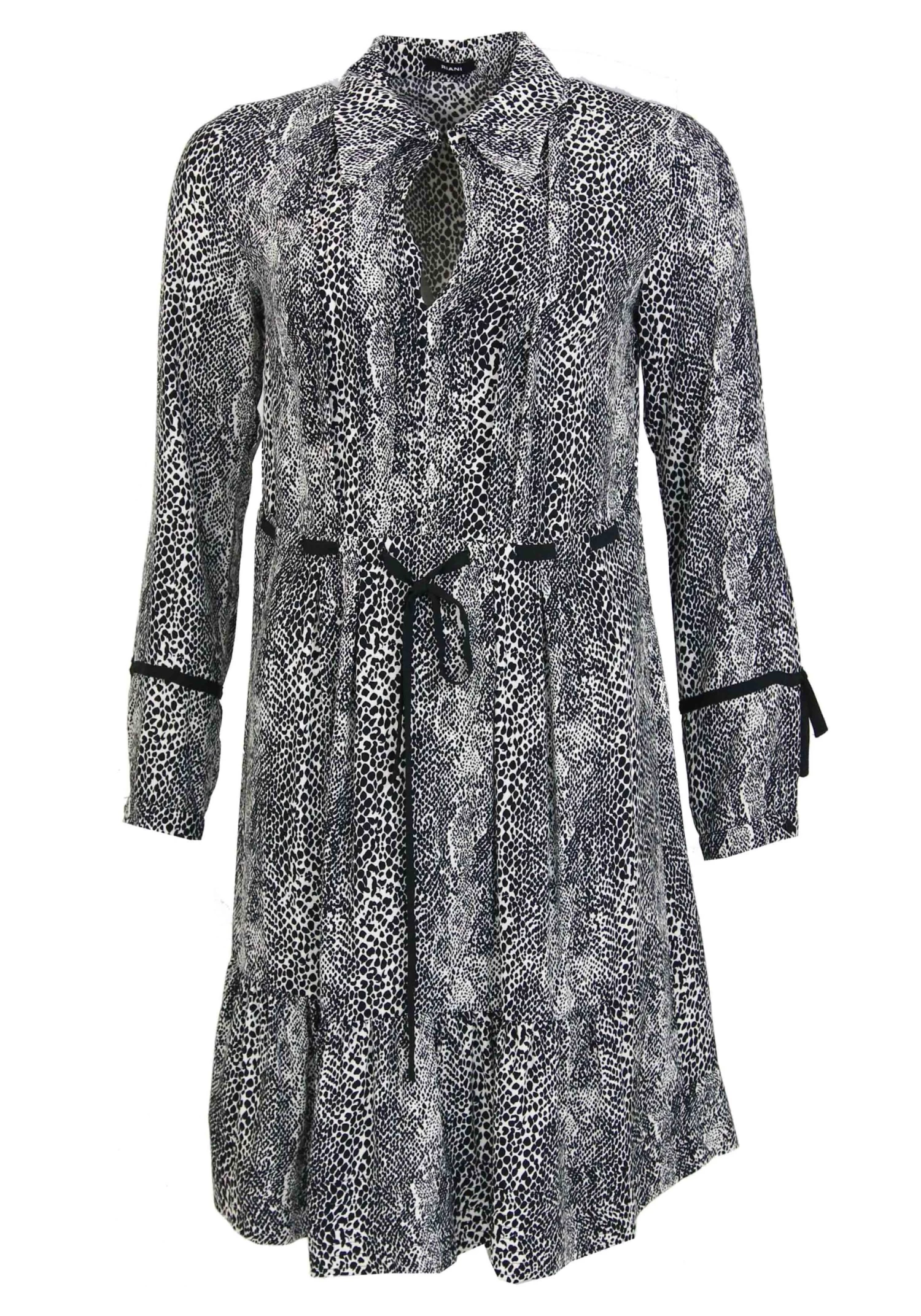 Een jurk van Riani in een slangenprint met de kleuren zwart en wit. In de taille is een smalle stoffen ceintuur welke deels verborgen is. De stof is aan de voor en achterzijde in een plissé. Ter hoogte van de onderarm is er een zwarte decoratieve bies met een strik. Onder de linker oksel is een rits. Deze jurk mag op de hand worden gewassen.