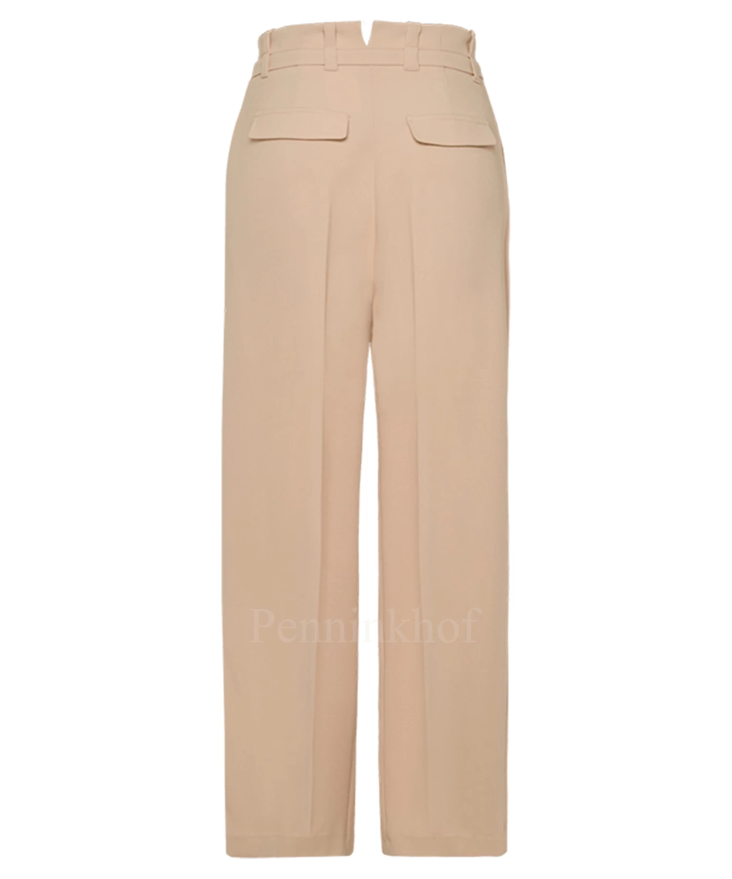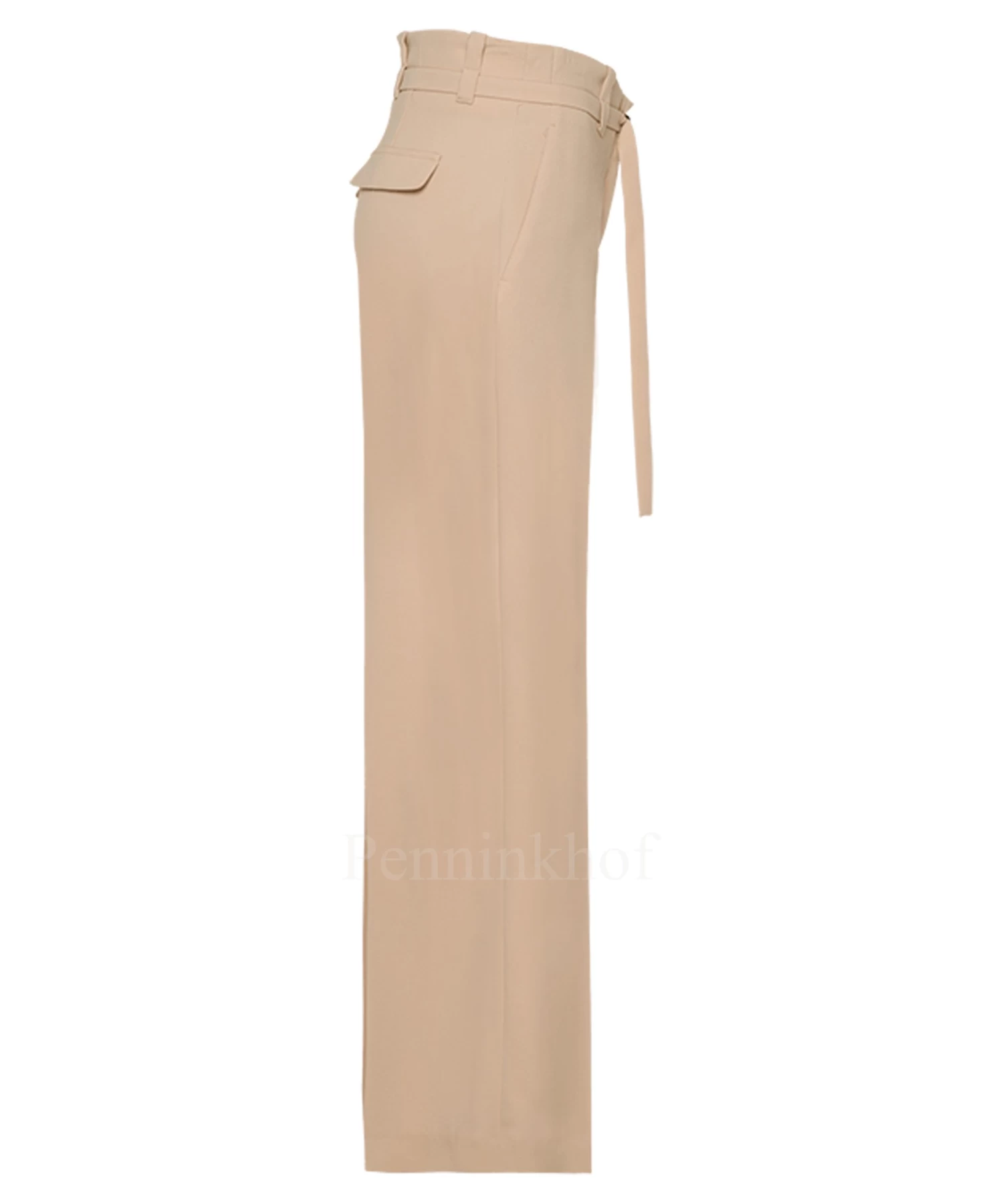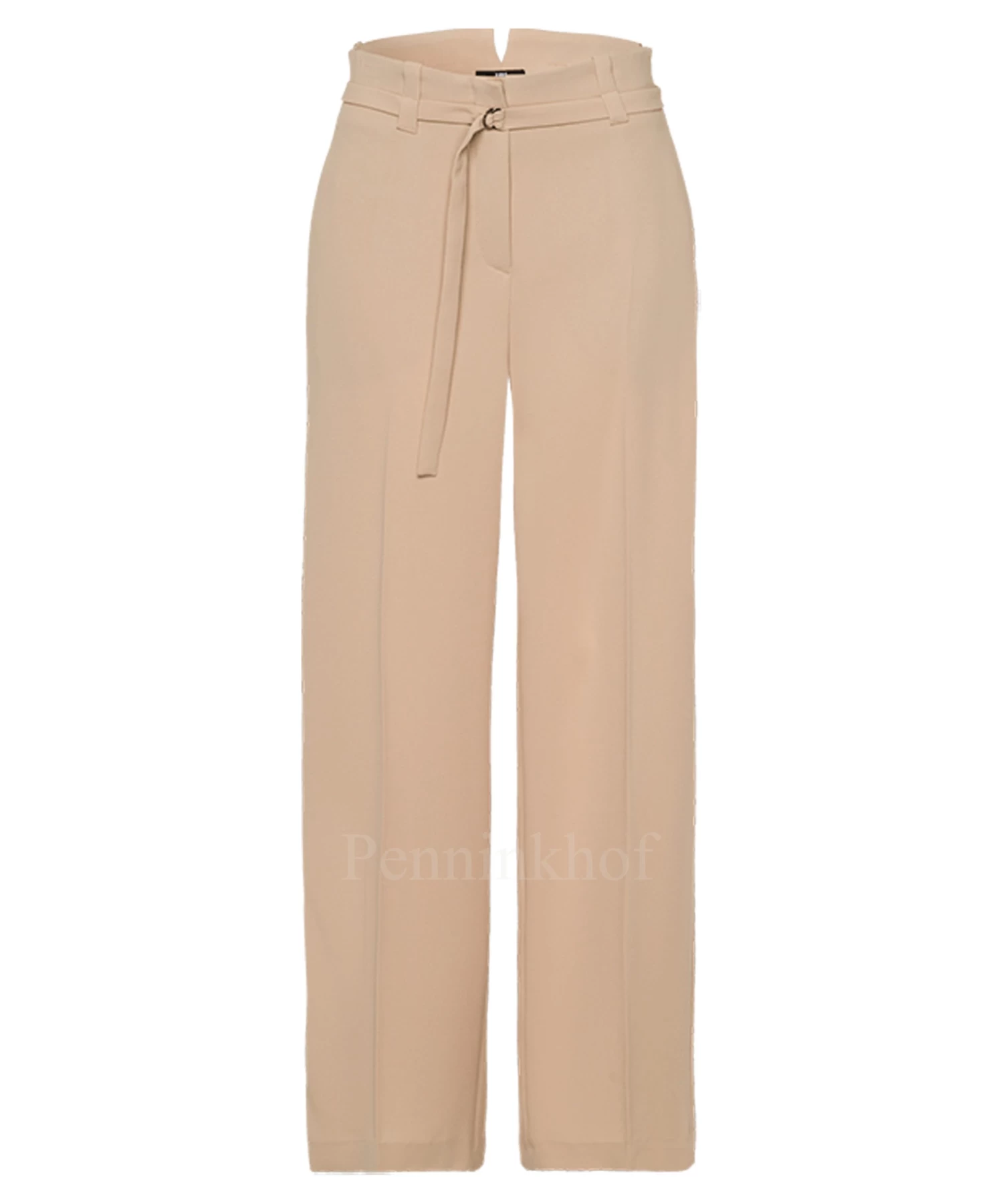 Een broek van Riani in een volle zandkleur. De broek heeft steekzakken en in de taille is een smalle ceintuur. Deze broek maf op 30 graden worden gewassen.