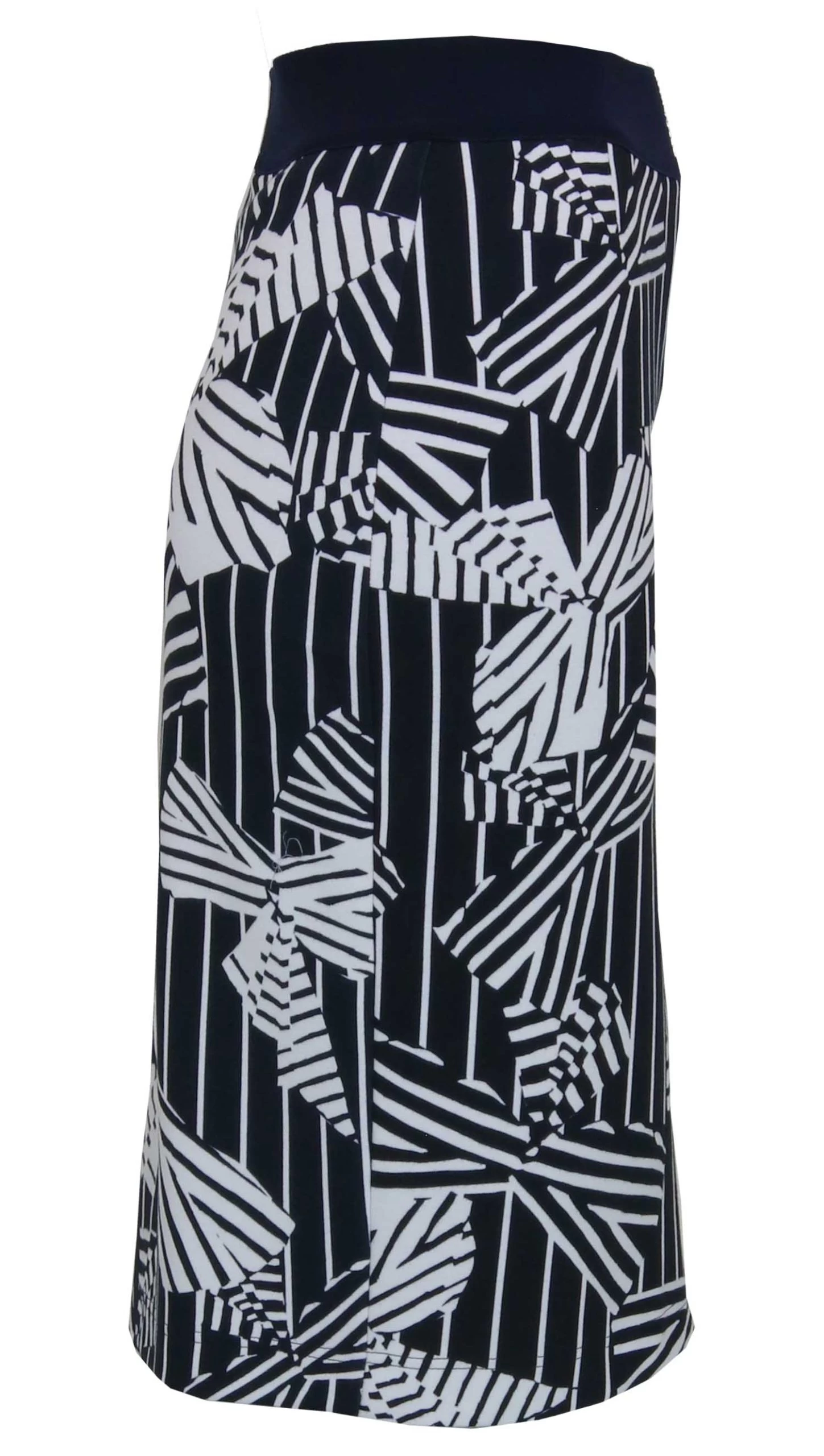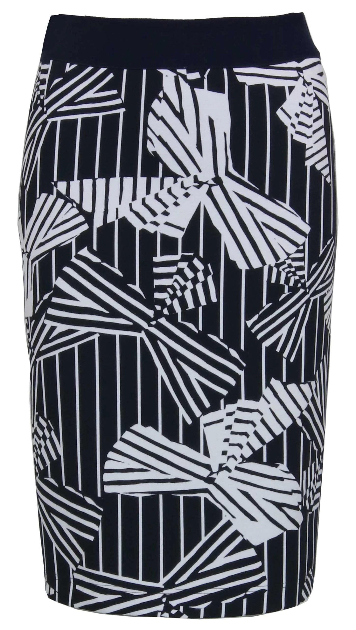 Een rok van Riani in een grafische print van strikken met de kleuren wit en marine blauw. In de taille is een brede elastieken band. De rok is gevoerd en valt over de knie. Deze rok mag niet worden gewassen.