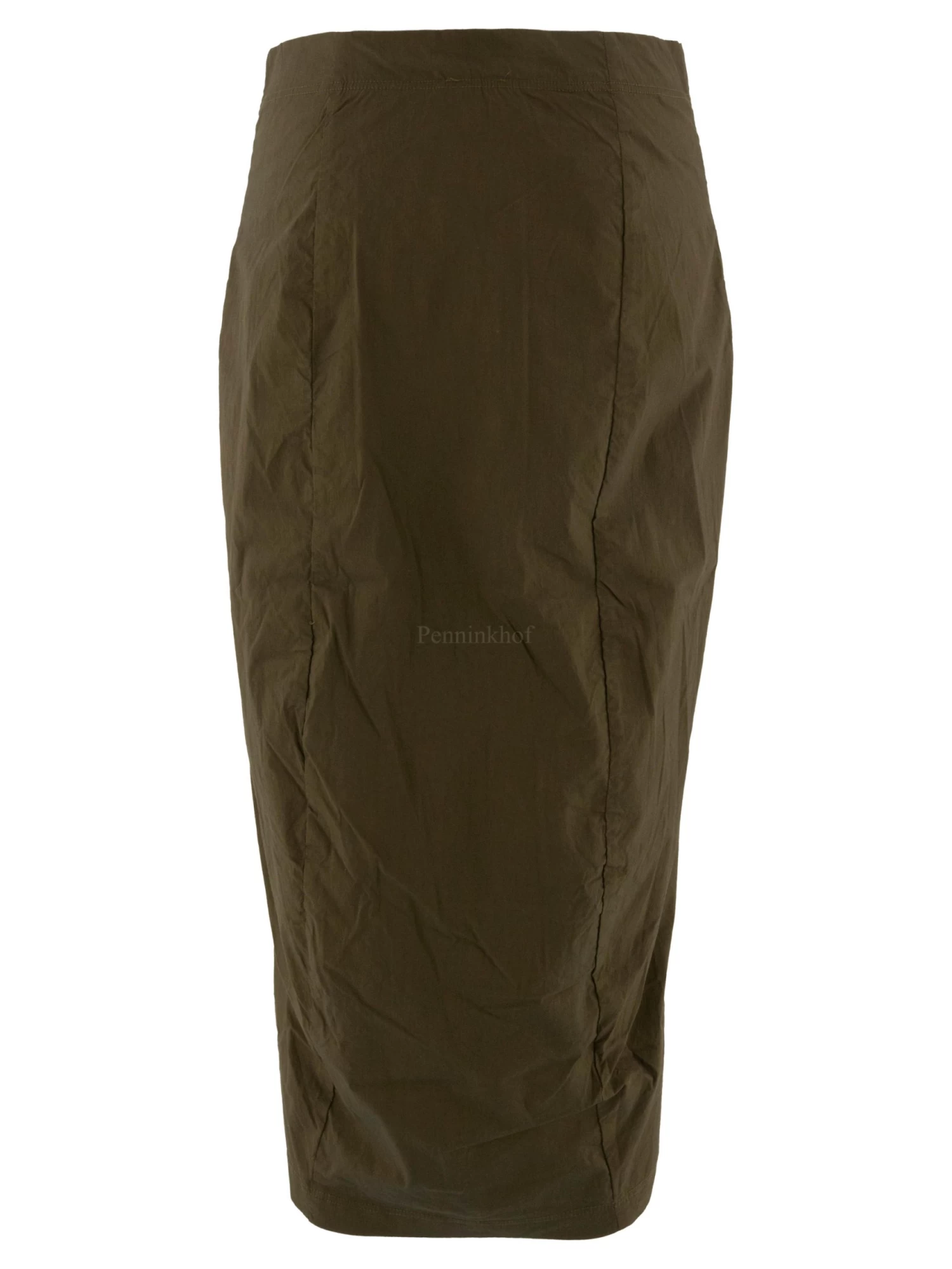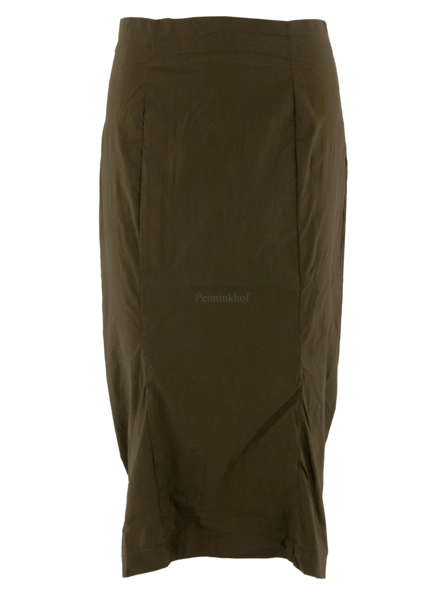 Een rok van Rundholz black label in de kleur olijfgroen. In de taille is de rok elastisch. De rok loopt taps toe en is ongevoerd. Deze rok mag op 30 graden worden gewassen.