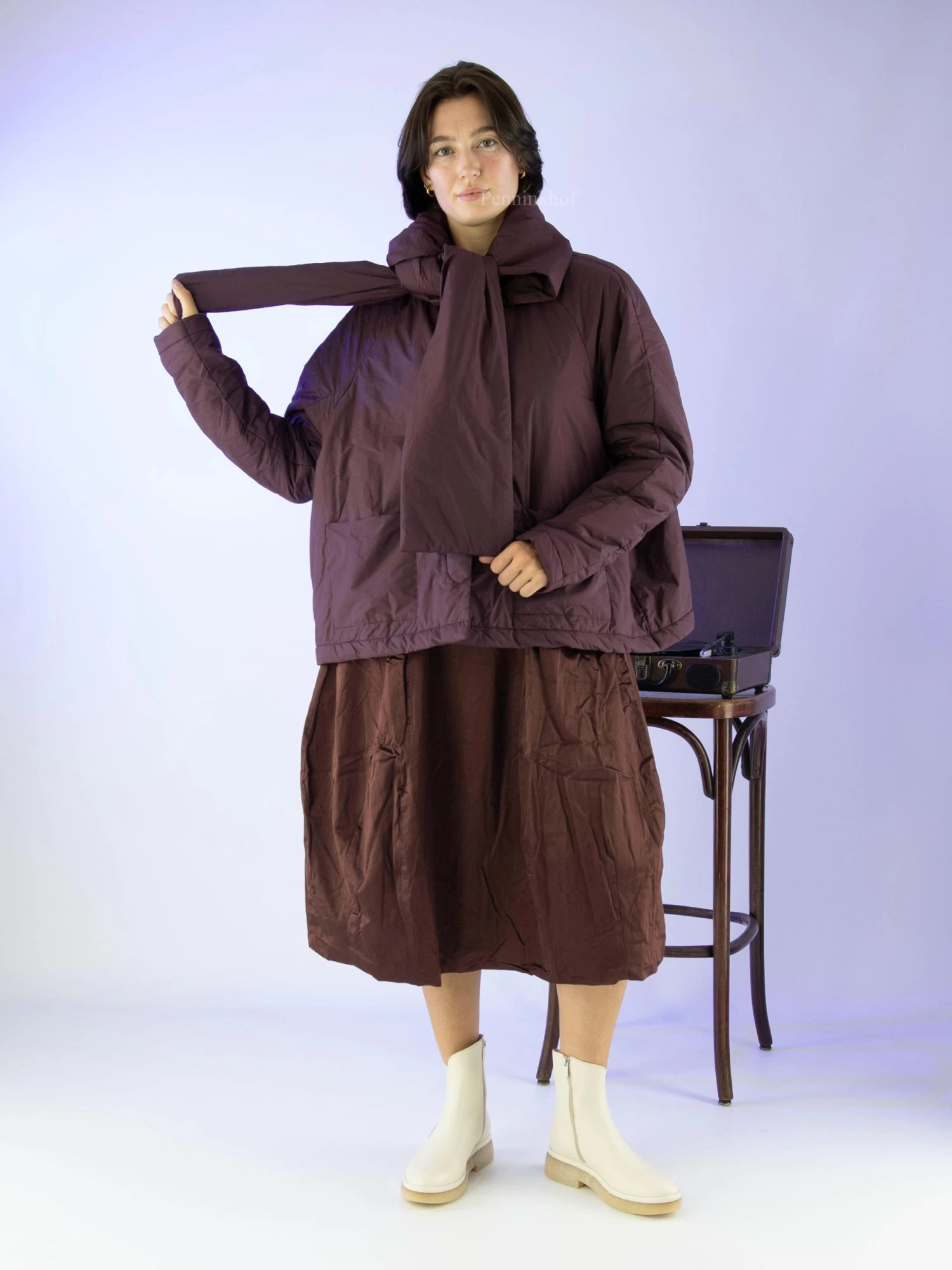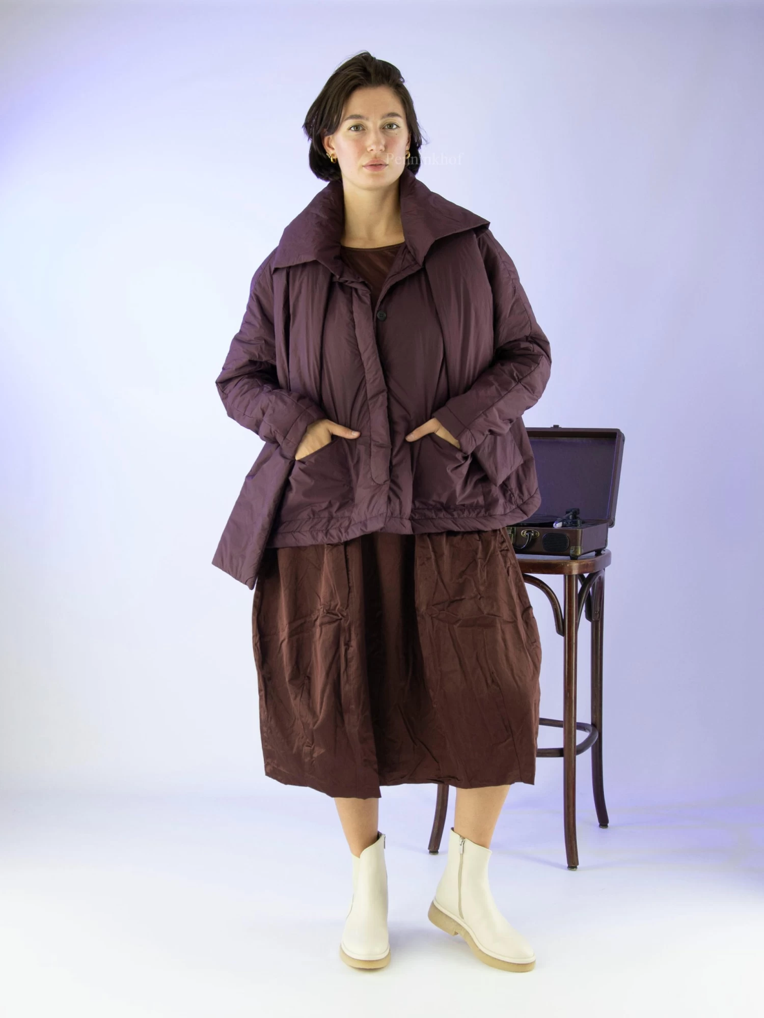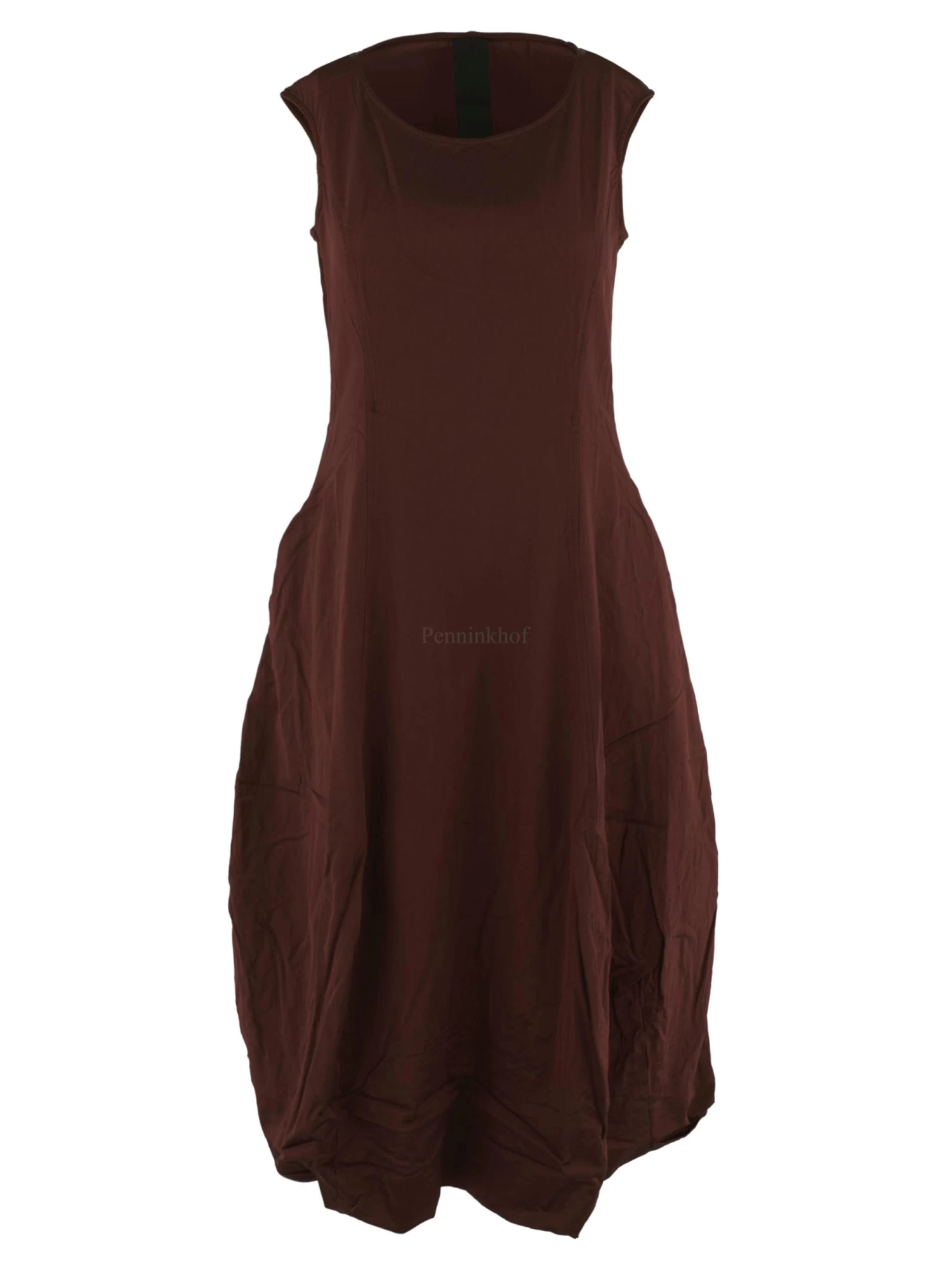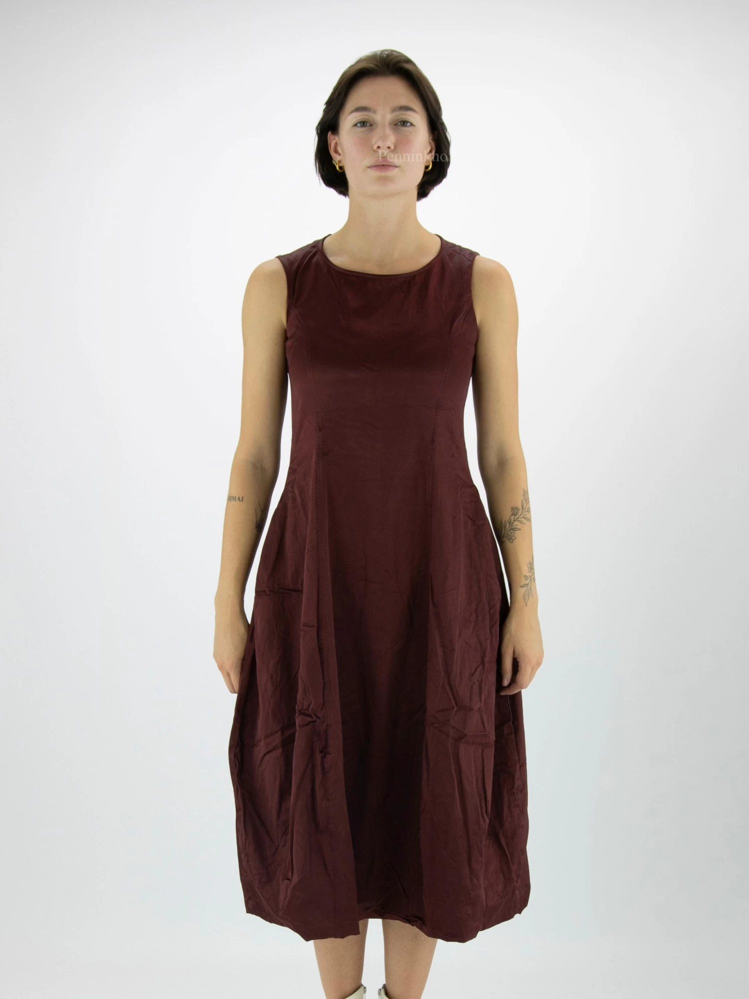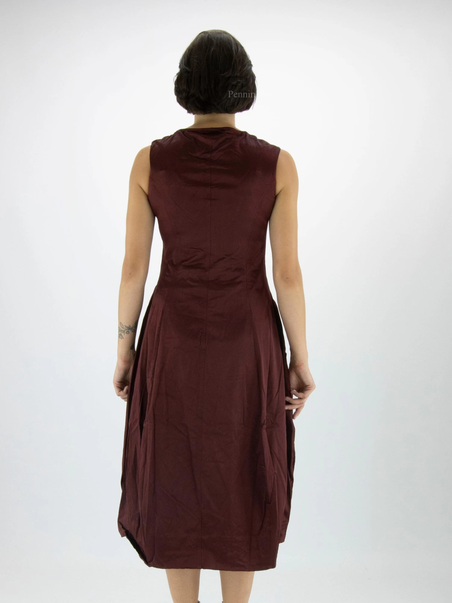 Een jurk van Rundholz in de kleur bordeauxrood. De jurk is in een mat satijnen stof die aan de binnenkant is gevoerd. Ter hoogte van de taille zijn steekzakken.. De jurk heeft een ballon vorm en mag op koud water worden gewassen.