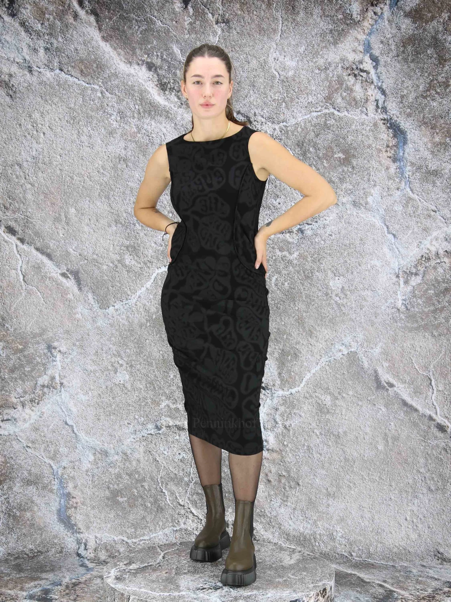 Een jurk van Rundholz black label in een barokprint met de kleuren grijs en zwart. De jurk heeft omgekeerde taillenaden. Deze jurk mag op 30 graden worden gewassen.