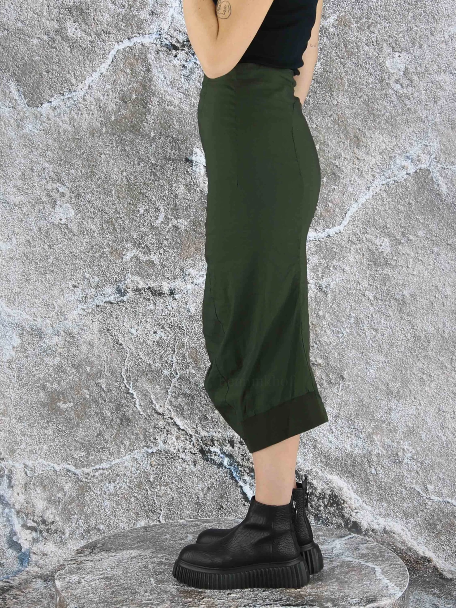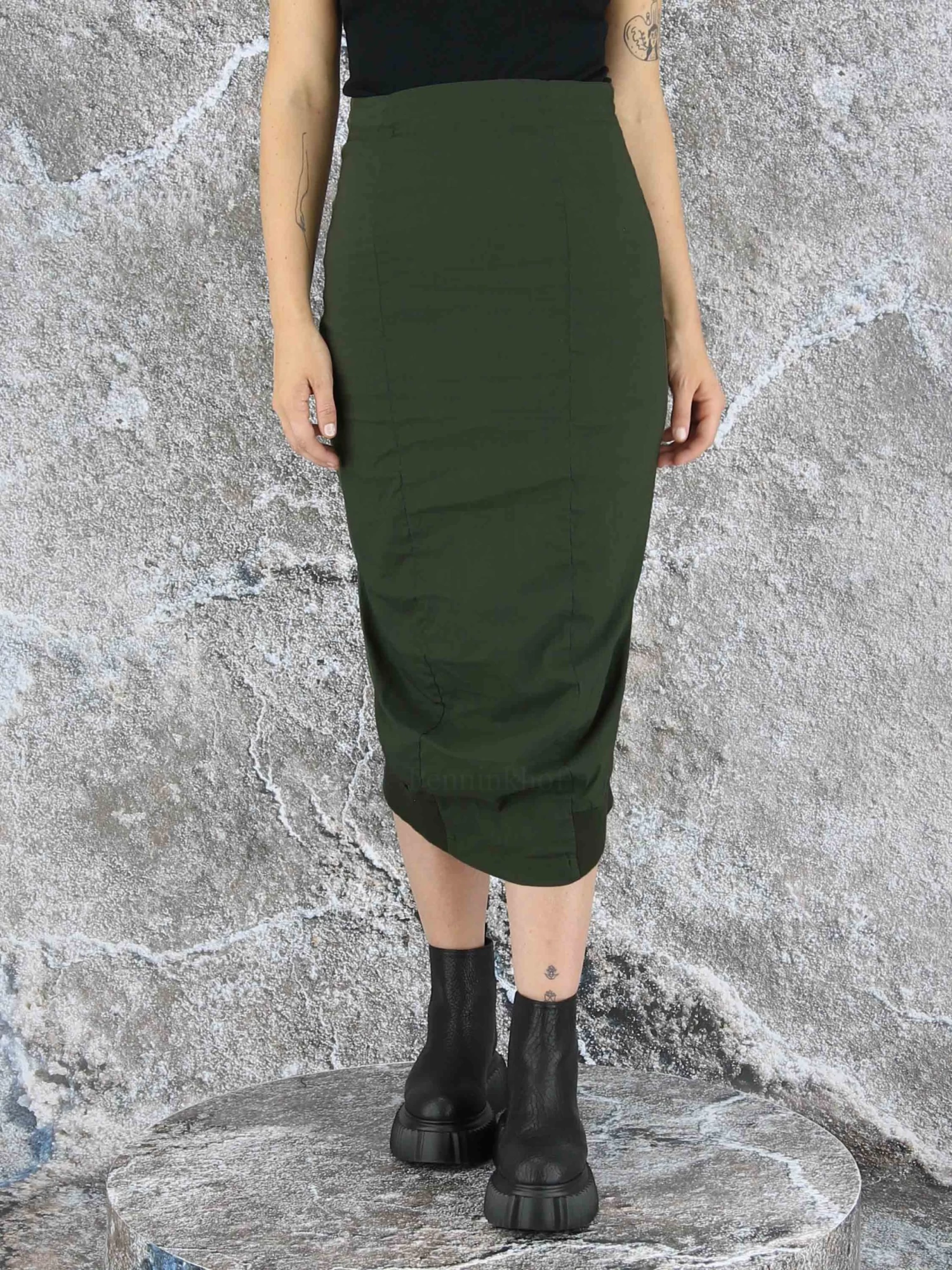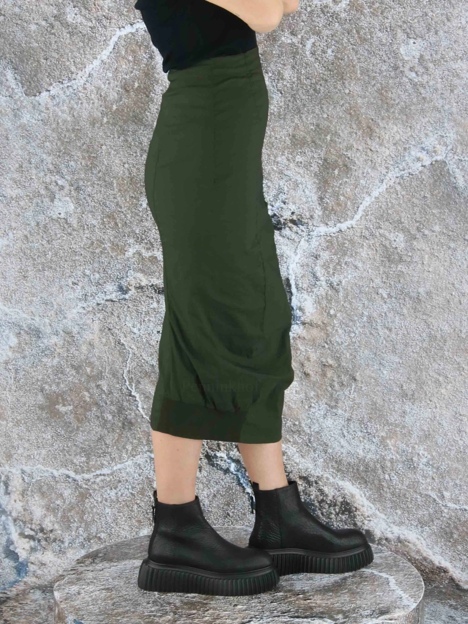 Een rok van Rundholz Black label in een olijfgroene kleur. Aan de onderkant is aan beide zijkanten een brede fijn geribbelde tricot boord. Deze rok mag op 30 graden worden gewassen.
