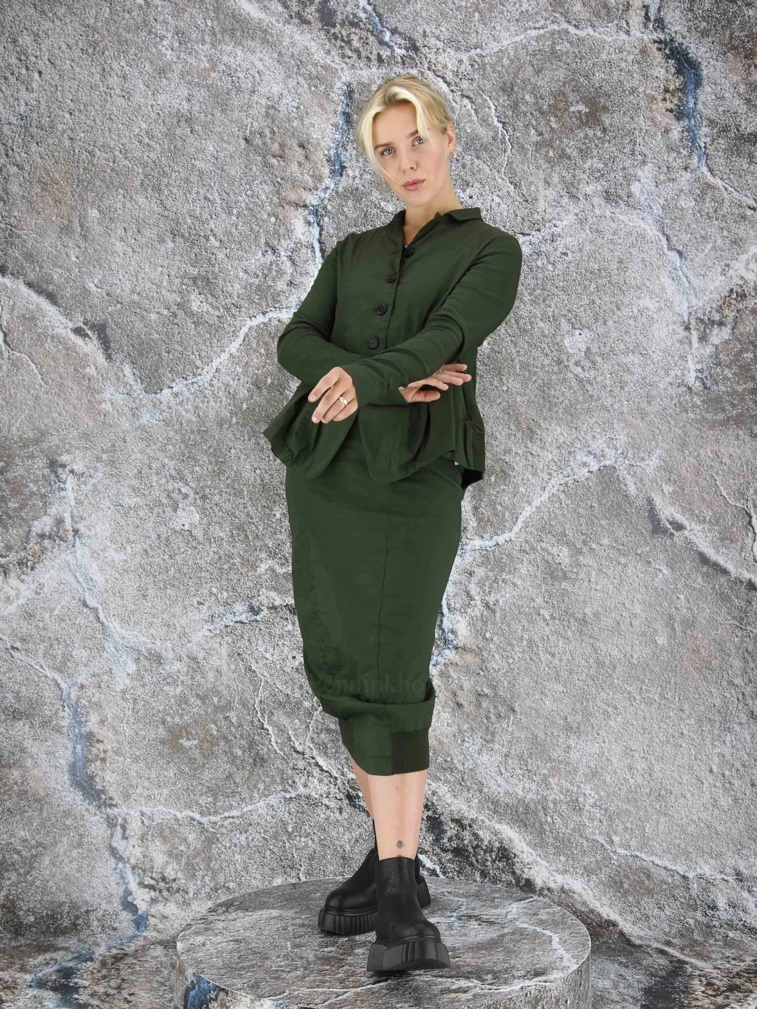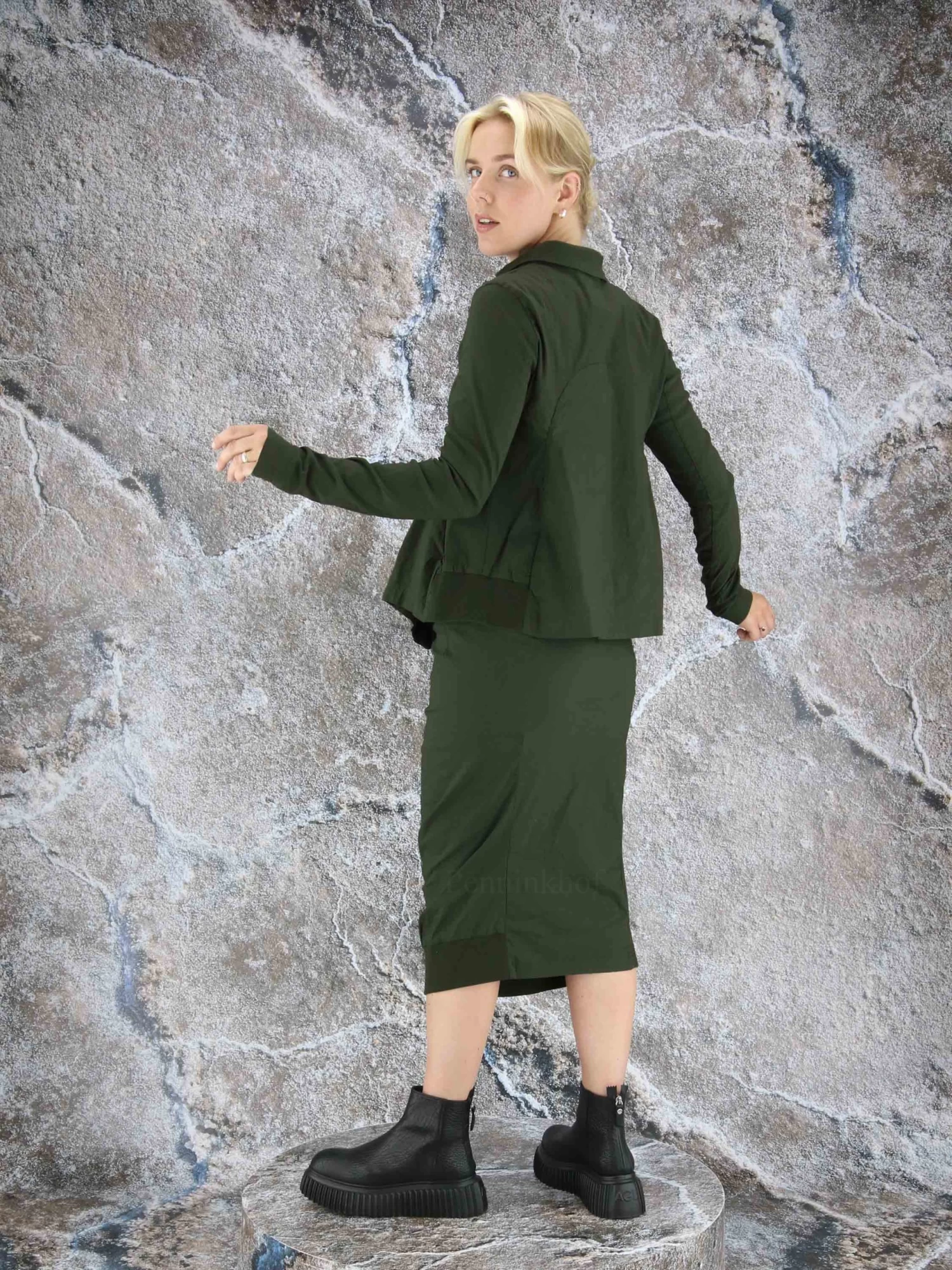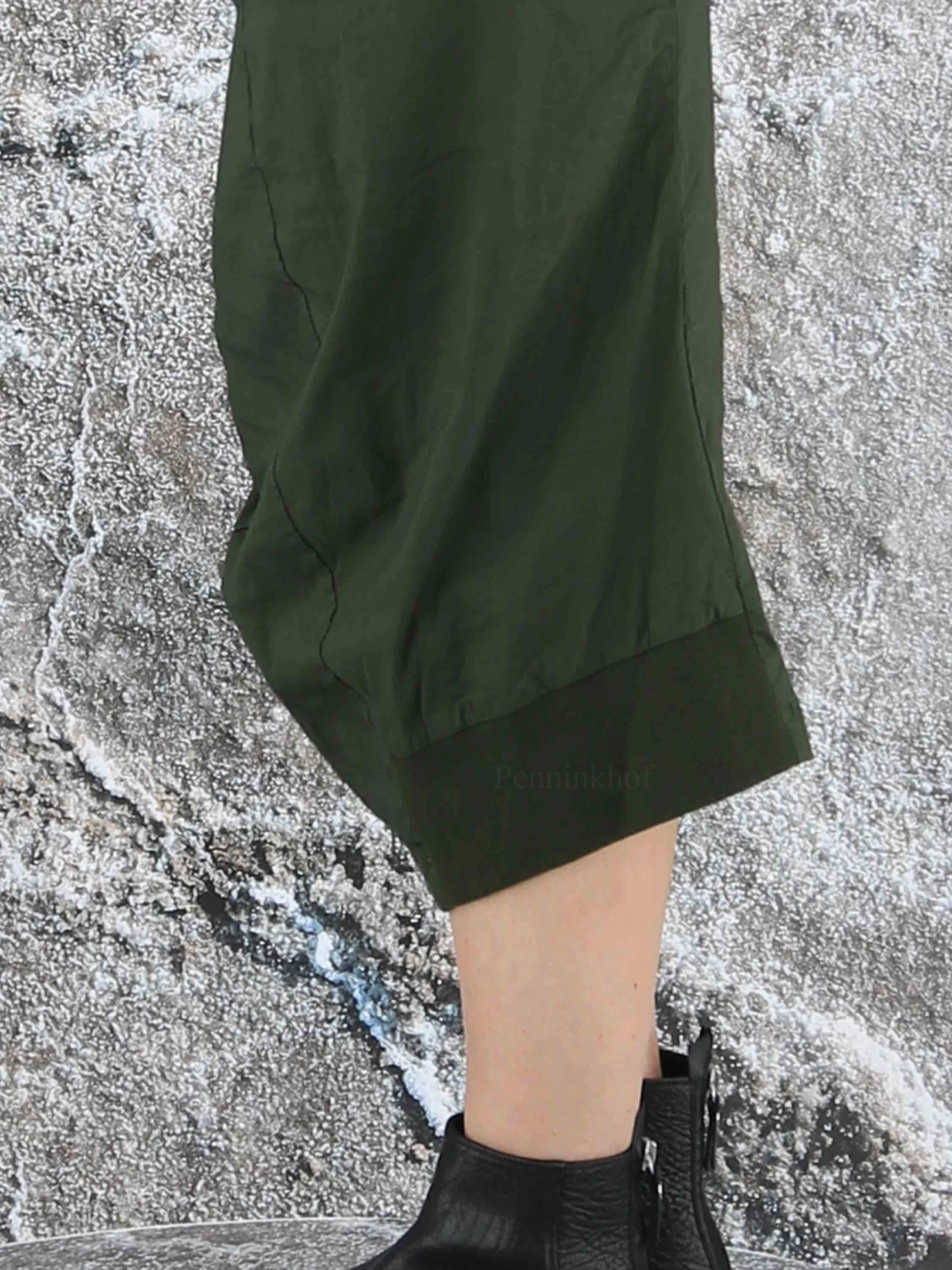 Een rok van Rundholz Black label in een olijfgroene kleur. Aan de onderkant is aan beide zijkanten een brede fijn geribbelde tricot boord. Deze rok mag op 30 graden worden gewassen.