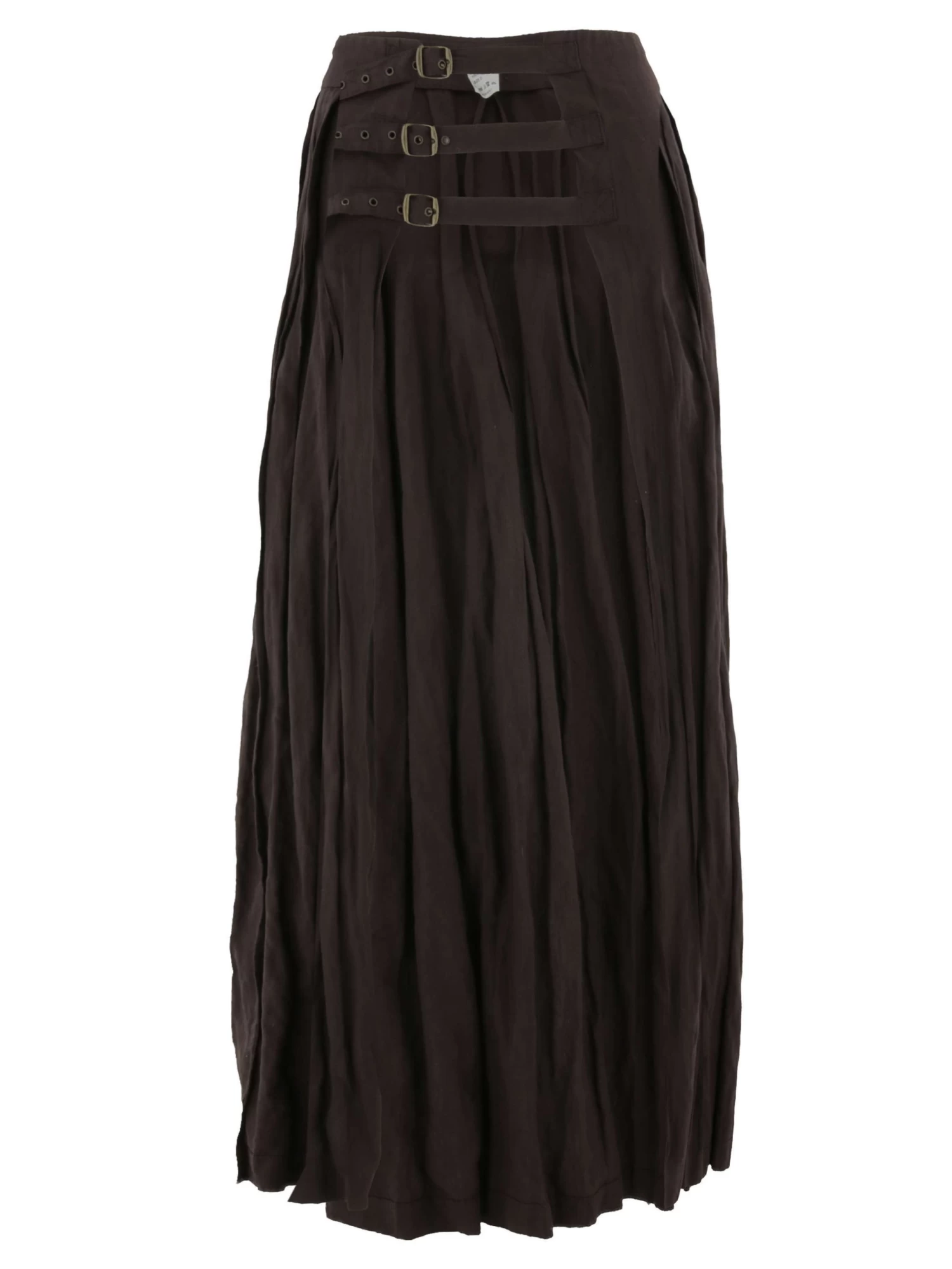 Een geplisseerde rok van Sarah Pacini in een mokka bruine kleur. De stof is fijn gekreukt. Aan de voorzijde zijn vanuit de taille 3 gespen. Deze rok mag niet worden gewassen.