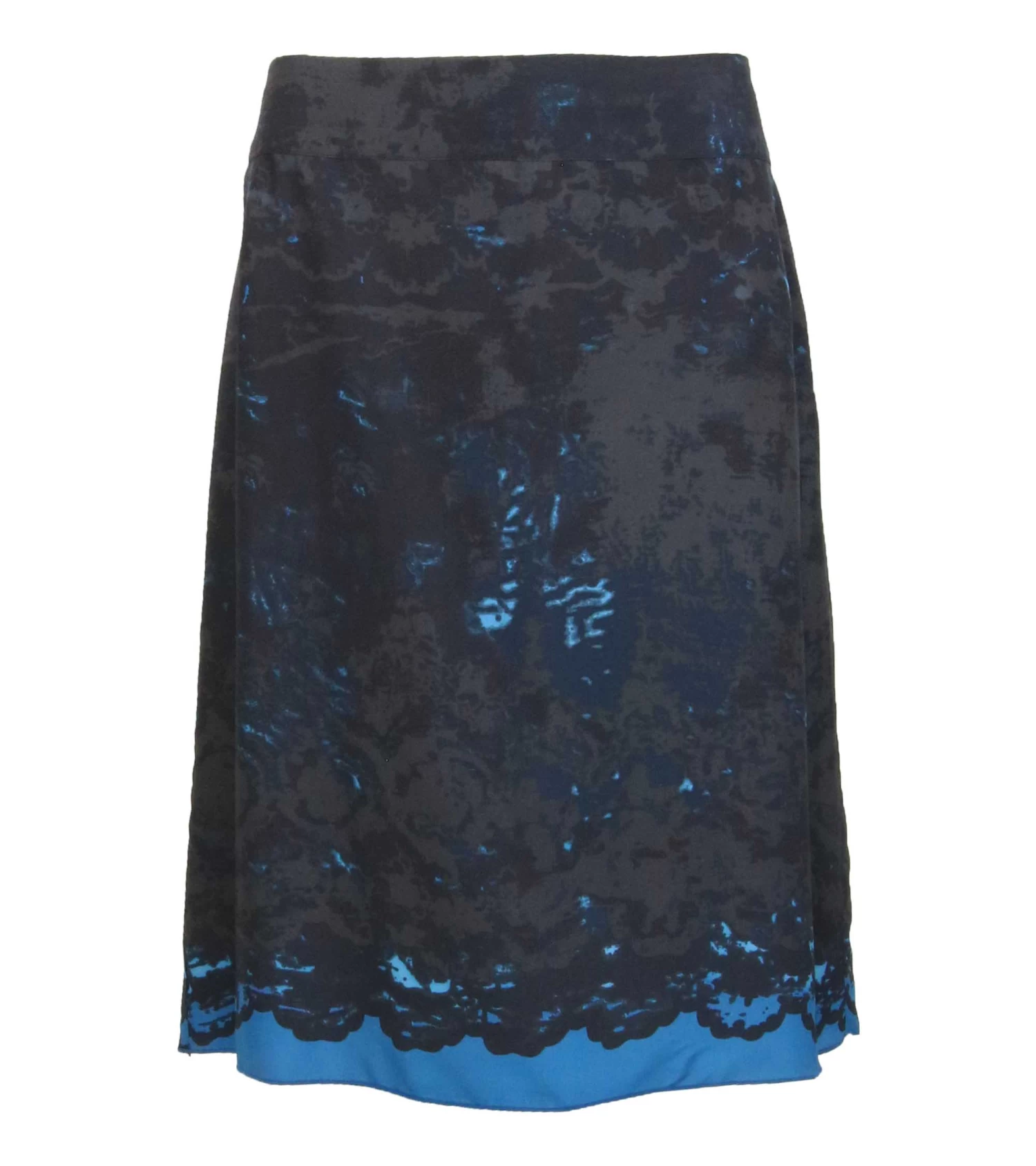 Een rok van Summum in een grafische print met de kleuren zwart, brons en aquablauw. De rok is gevoerd en valt net over de knie. Deze rok mag op de hand worden gewassen.