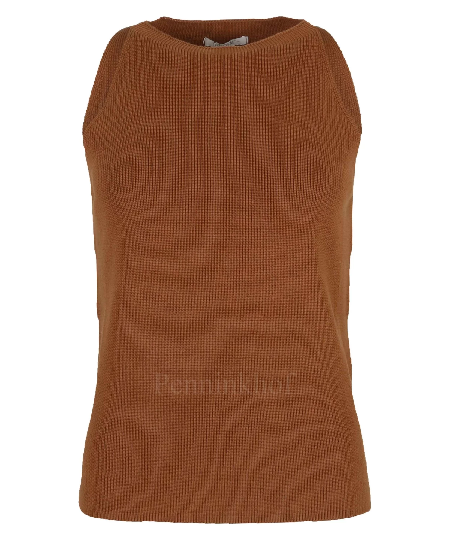 Een gebreide top van Tandem in de kleur bruin. De top heeft een ronde hals en mag op 30 graden worden gewassen.